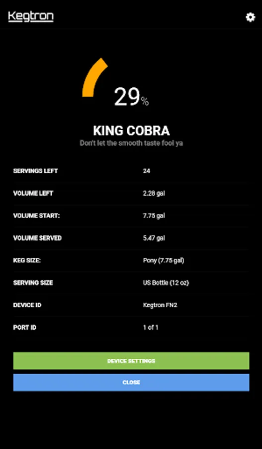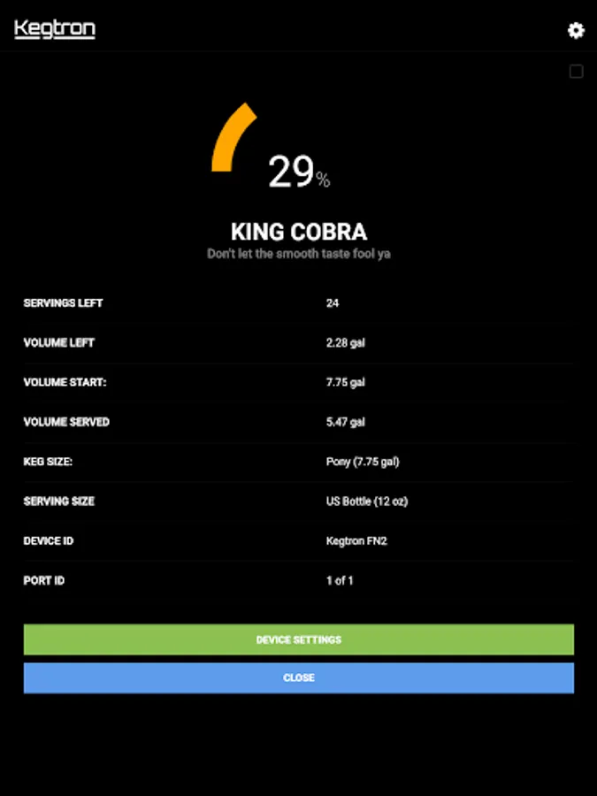 The Kegtron app gives you full visibility to the status of your kegs via our wirelessly-connected keg monitor devices. Always know the precise state of your kegs by checking your app. See real-time stats on keg size, volume, percent remaining, drinks remaining and more.