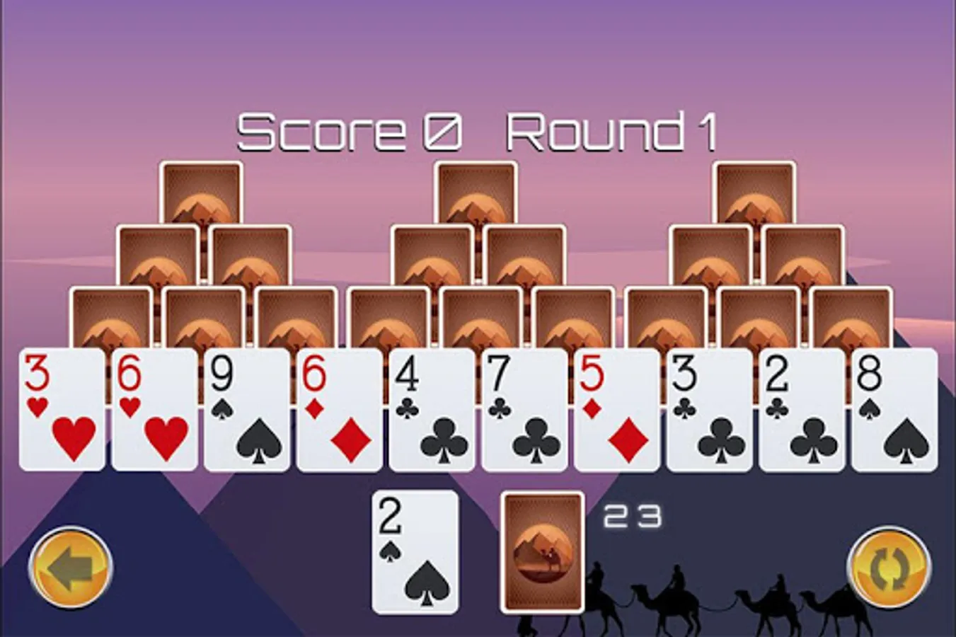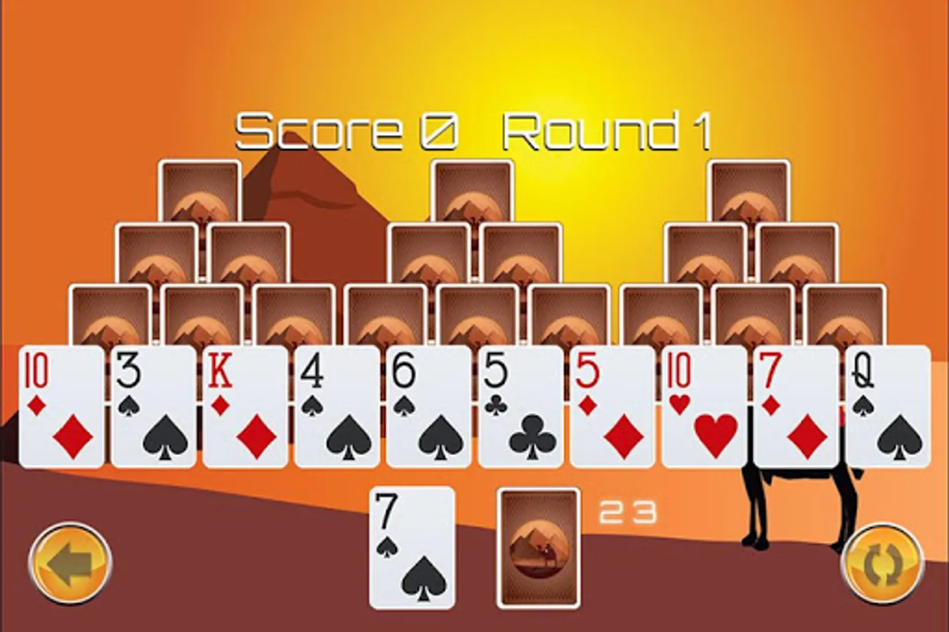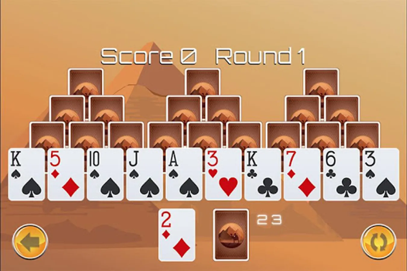 Clear out a stack of 28 cards dealt in the shape of three connected pyramids. You can clear a card from the pyramids if it is higher or lower than the card at the bottom of the screen. If you cannot match any cards simply click the deck to deal another card from the 24 cards in the deck at the start of the Round. You can go "around the horn" and match a King to an Ace and vice versa. If you deal all of your cards and cannot match the game will be over.