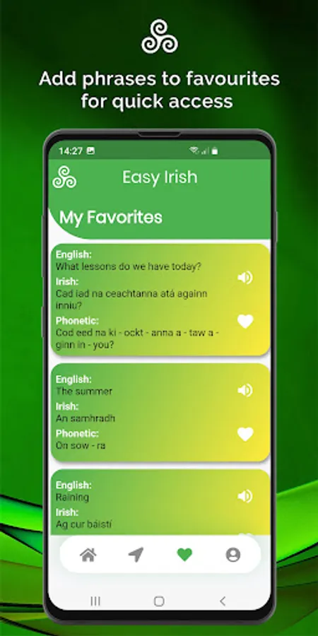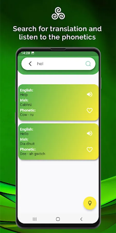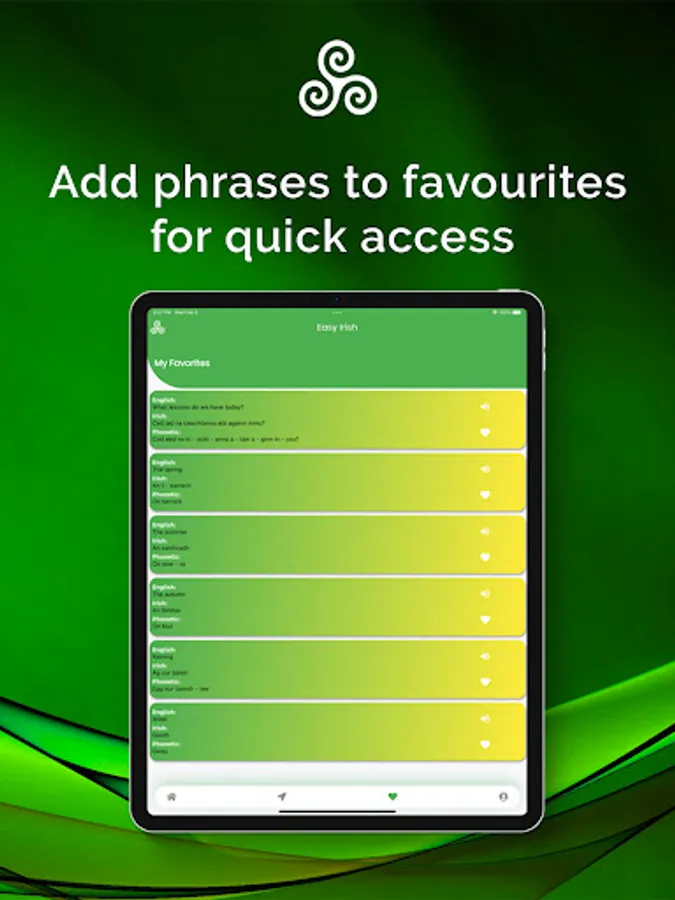This app has been developed to assist those that wish to learn, speak and pronounce the Irish language with their friends, family and youngsters with a simplistic user experience and some personal touches from the developers. It's a fun and easy way to instantly speak Irish using phonetics. Ideal for beginners, just say what you read.