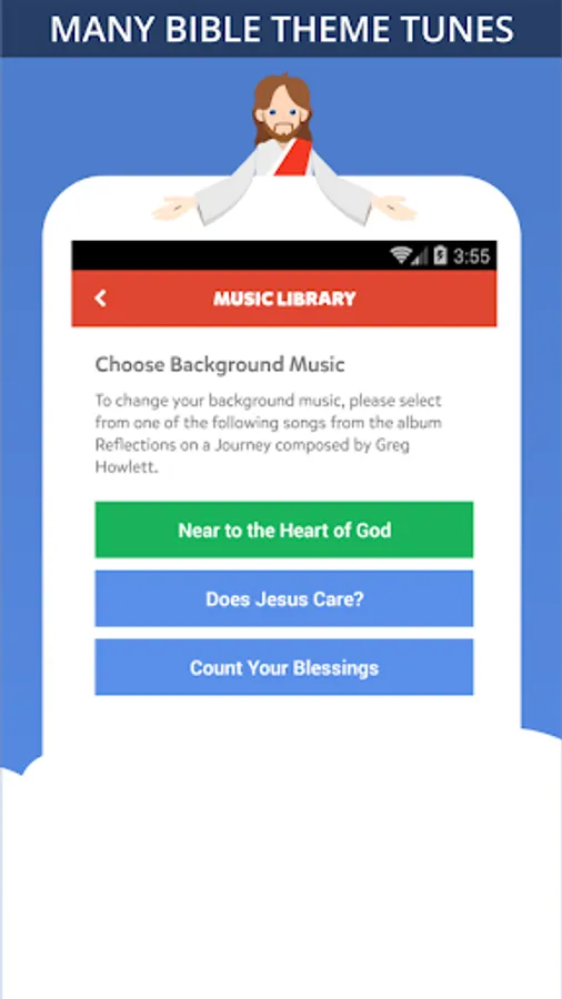 ✞ - Music selection - Choose from 3 different Hymns or mute sound and music.