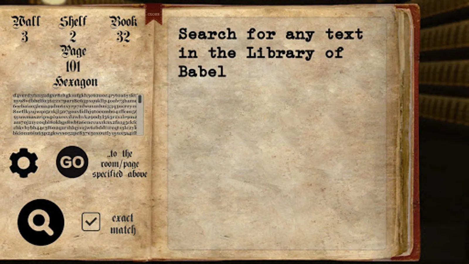 To make your life a bit easier, there is a built in search menu that lets you search for whatever text that comes to your mind. After you hit the search button don't forget to press "GO" so that you are taken to the exact location of the book that contains your search phrase. ( Also, don't tell the librarians about this search machine of yours. They might steal it and throw you over the railing into the endless pit of darkness in the middle of the hexagons. )