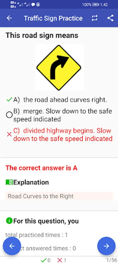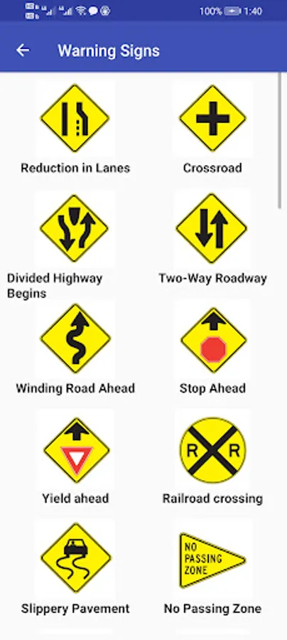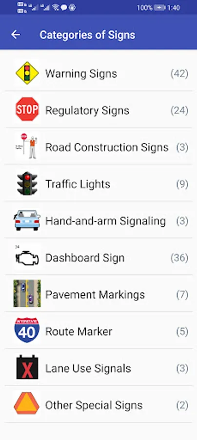 Traffic Signs are organized into different groups, e.g. warning signs, regulatory signs. And they can be shown in a list or flashcard mode. A straight forward and clear way for you to learn these signs.