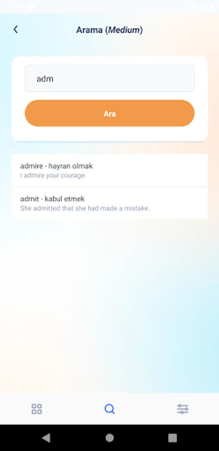 - Search for an English word on the search screen, quickly see the English word in the results, the Turkish translation of the word and the use of the English word in the sentence.