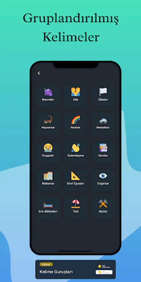 Guruplandırılmış kelimeler ile istediğiniz alandaki kelimelere özel olarak çalışabilir bu kelimeler ile ilgili soruları çözebilirsiniz.