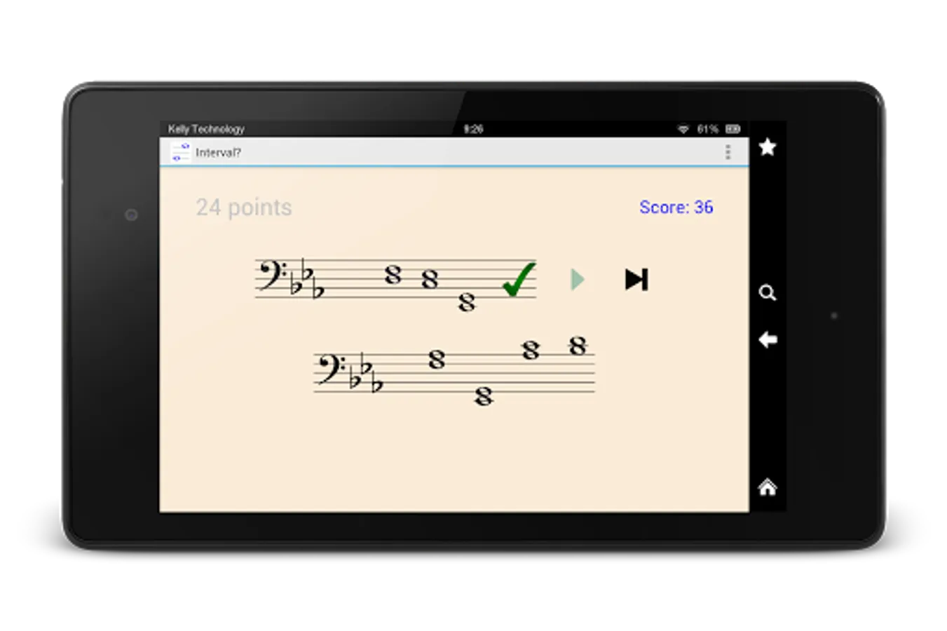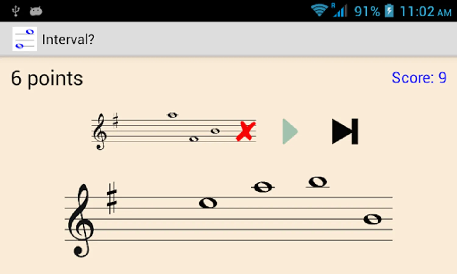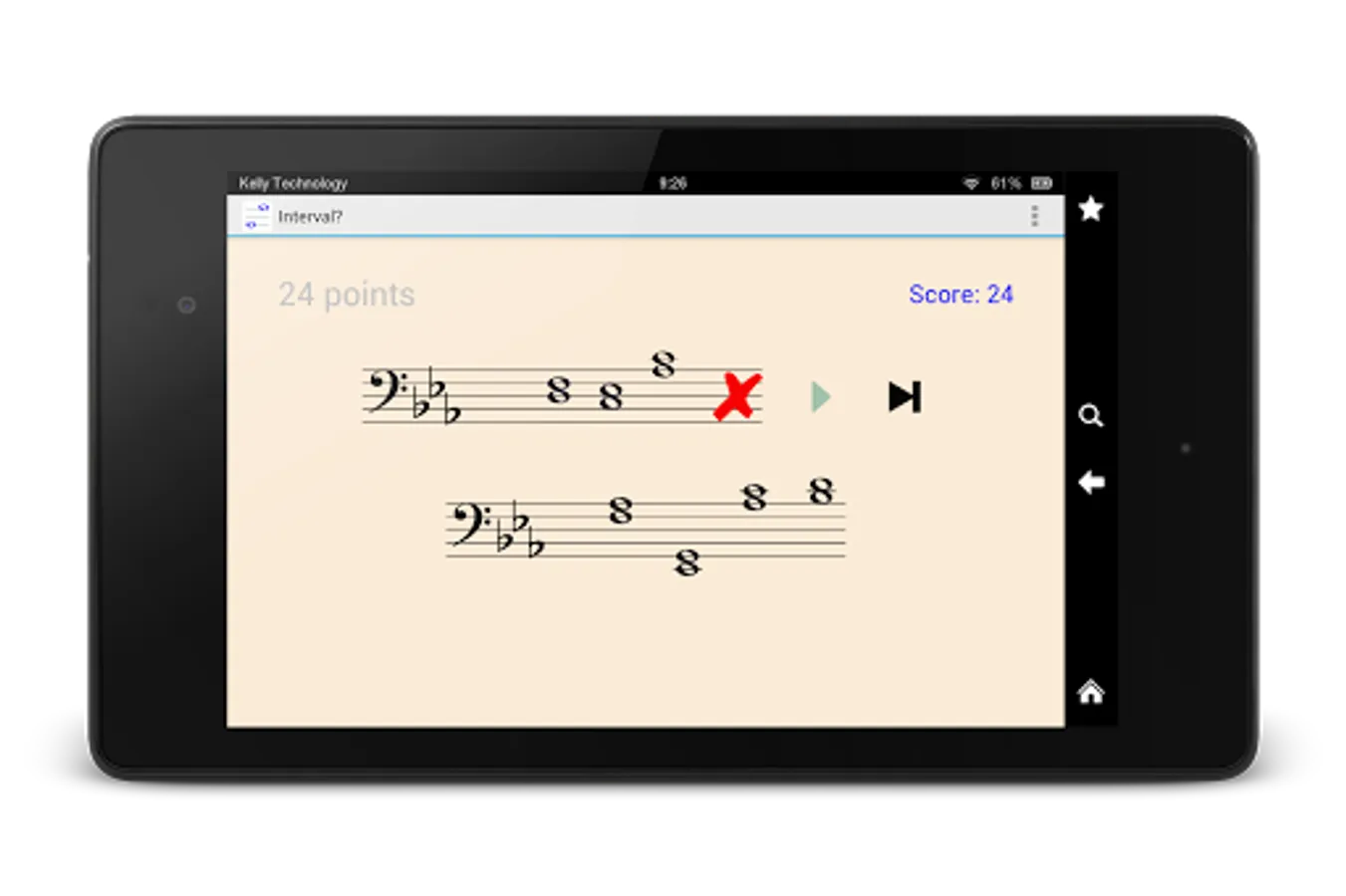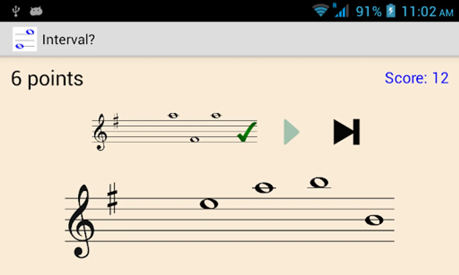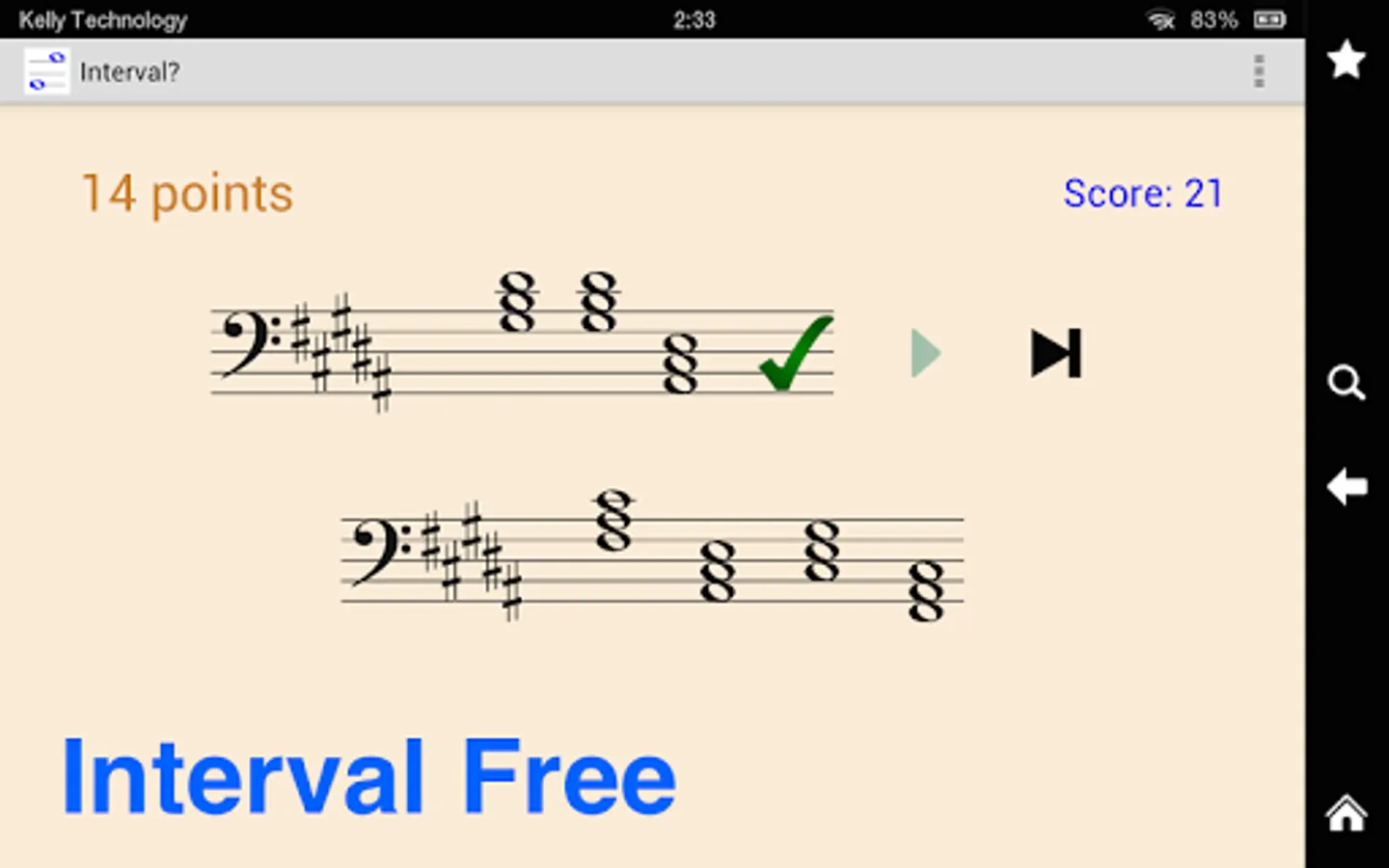 Challenge your musical skill with Interval by determining which chord was played. For each puzzle, three chords are played with the musical notation displayed for the first two. The third chord will be one of four choices displayed - choose your answer by touching the right chord. The point value for each game will be added to your score for the correct answer, but half the points will be deducted for each wrong one. You can play the three chords as many times as you like, and you can move on to the next puzzle without answering and without penalty. Your musical knowledge will increase with repeated playing of the game. You can choose between piano and church organ for the game's instrument.