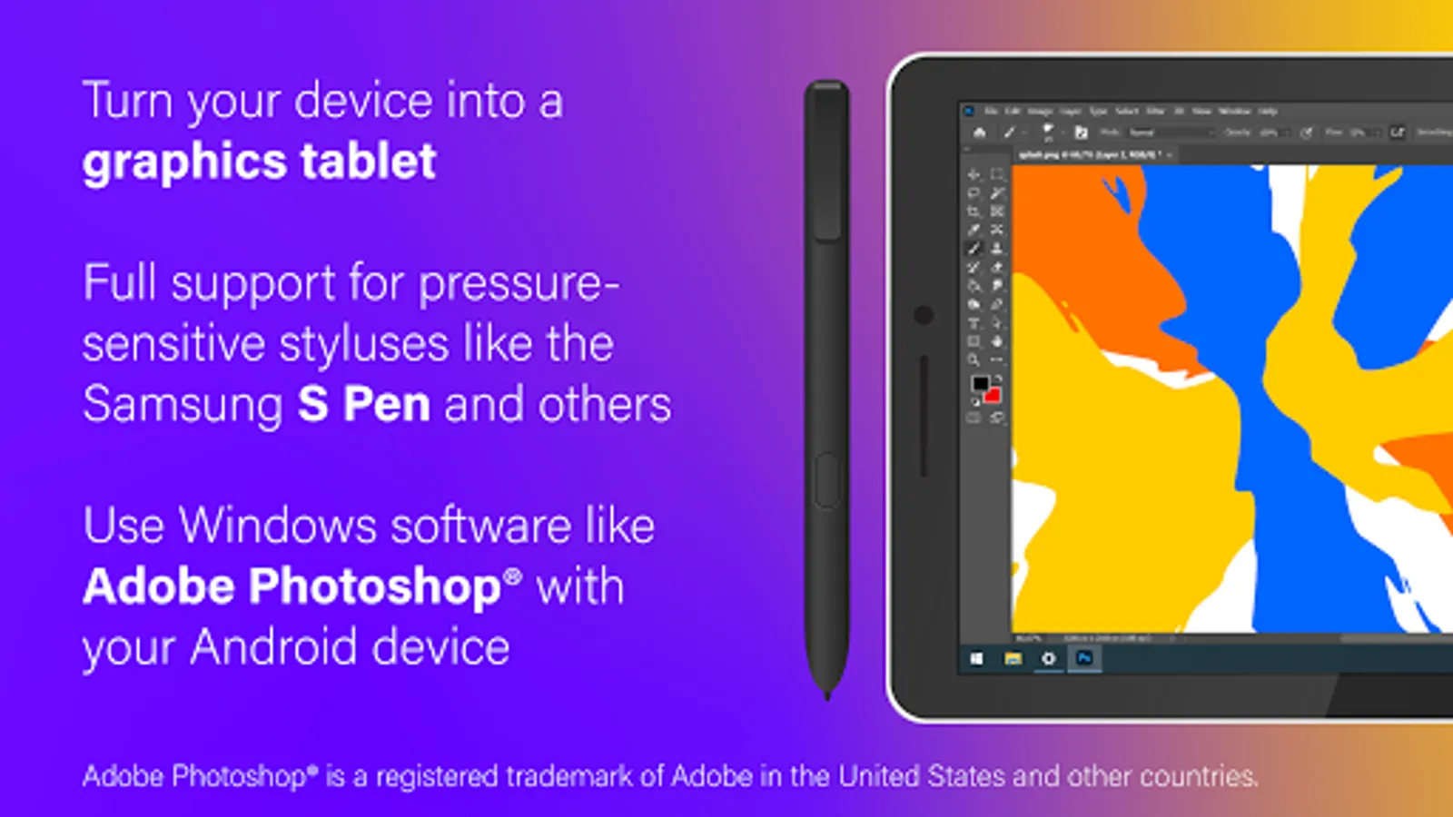 Turn your Android device into a graphics tablet and use apps like Adobe Photoshop® through it. SuperDisplay supports pressure-sensitive styluses like the Samsung S Pen making it ideal for digital art and other creative work.