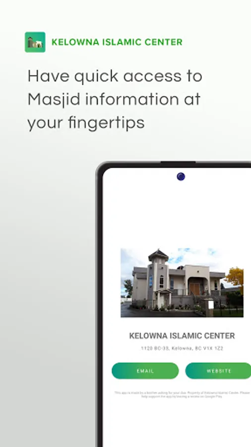 Find Iqamah times, announcements, contact information, and more in the official Kelowna Islamic app for android. Whether you are in Kelowna or travelling, Kelowna Islamic Center's app will offer accurate and real-time Iqamah and Start times for Kelowna which are updated every day. For the latest news and updates, our app offers real-time announcements.