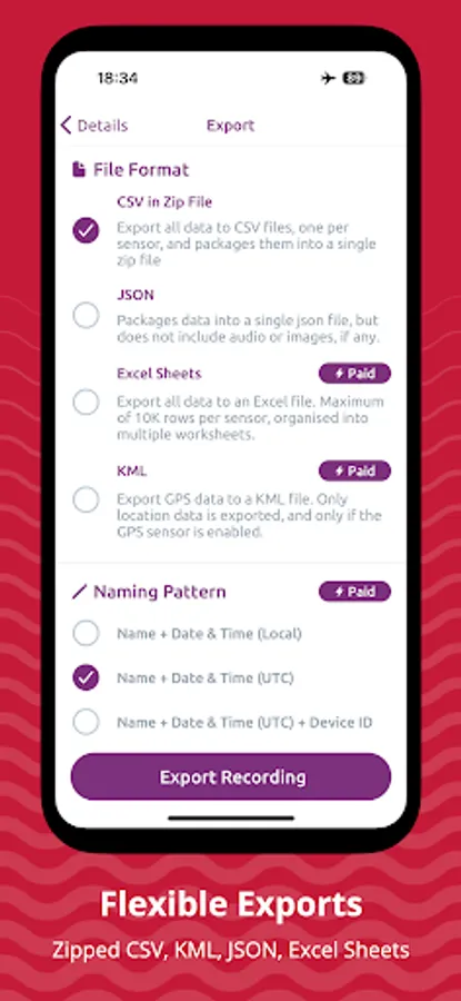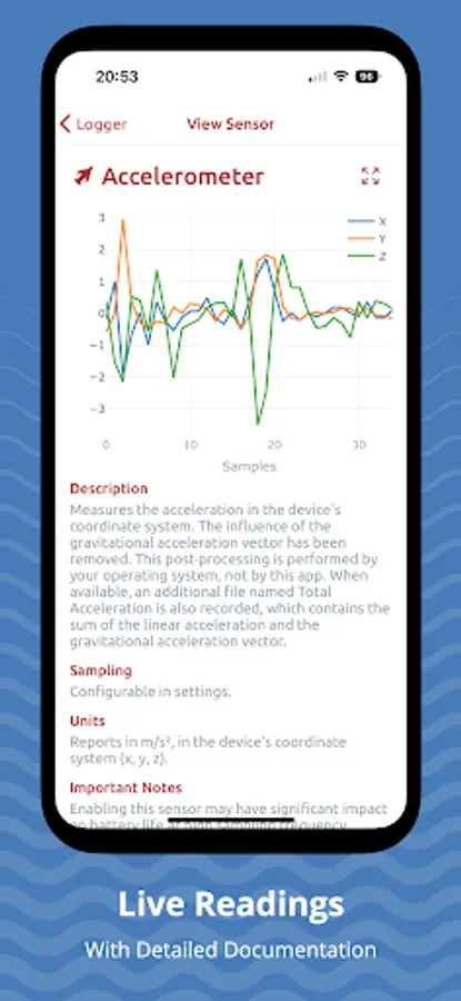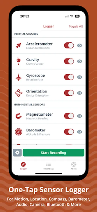 Sensor Logger is an easy-to-use, beautifully designed data logger that logs readings from common sensors on your phone — including accelerometer, gyroscope, GPS, audio, camera and bluetooth devices. An intuitive interface allows you to select your desired sensors. A simple tap of a button initiates the recording function, which works even when the app is in the background. You can view and manage recordings within the app via interactive plots. The export functionality conveniently outputs your recordings in a variety of formats, including Zipped CSV, JSON, Excel and Kml. For advanced use cases, you may also stream data via HTTP during a recording session, or create Studies to collect recordings from other Sensor Logger users systematically with ease.