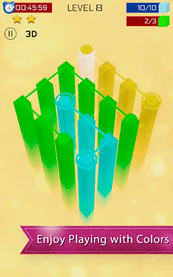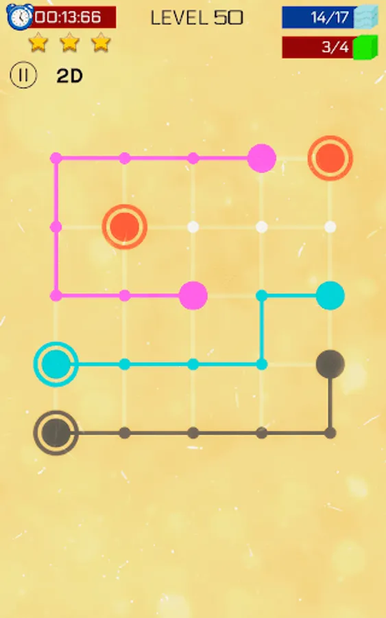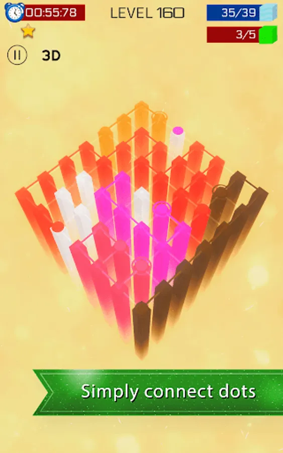 The Dots Connect 3D, the free flow game, comes with a clean and neat design and the super user-friendly interface along with the easy to learn gameplay enables you to get used to the gameplay after playing the first easy levels. If you are not familiar with such dots and boxes games, you just need to connect the matching color squares by drawing lines. Your moves are limited and you need to make sure the lines never cross each other.