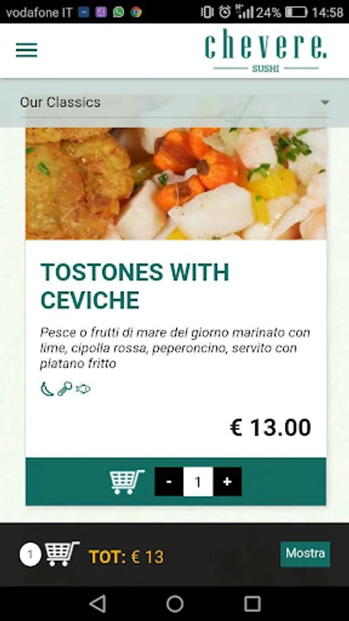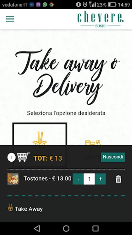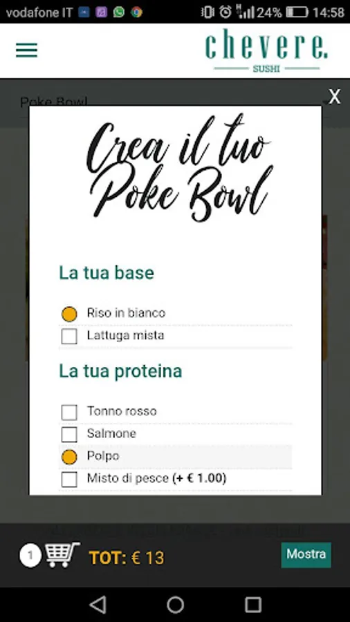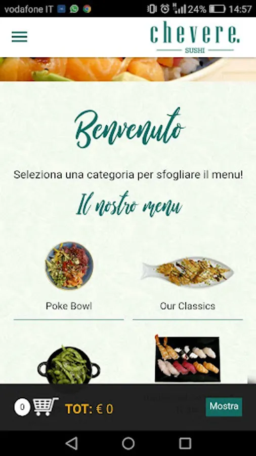 With Chevere you can order your Sushi or your Poke bowl! We are in Acireale. Browse the menu, choose what you want to order, select the mode (take away or delivery) and complete the order (payment in advance or in cash). All in a few simple clicks.