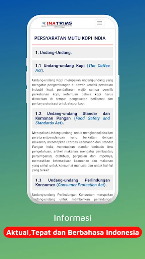Application to help business actors, especially exporters and prospective exporters, find out information on technical regulations and quality requirements in export destination countries. By understanding the technical regulations and quality requirements in the destination country, business actors can prepare products according to international requirements thereby increasing the credibility of business actors as producers who pay attention to product quality.