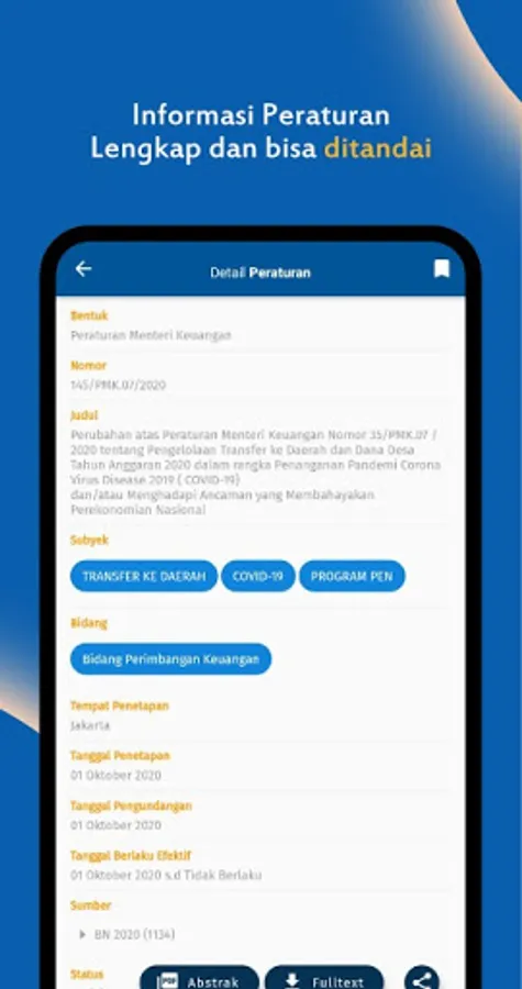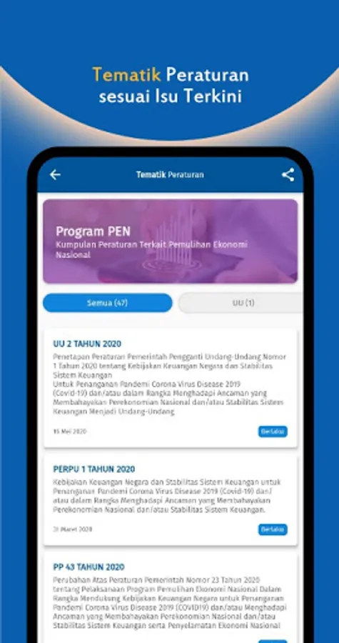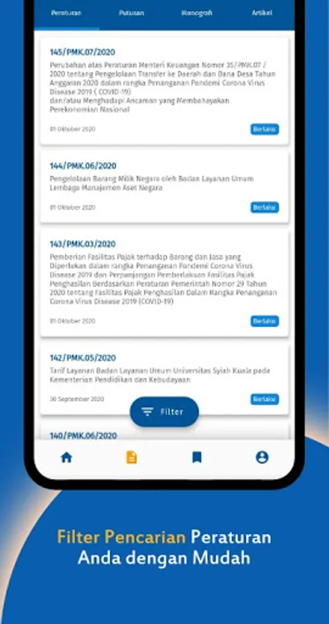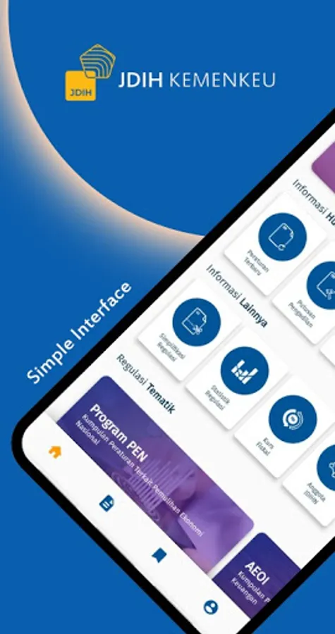 This application is a service provided by the Ministry of Finance of the Republic of Indonesia to the public in the form of providing information related to laws and regulations in the field of finance and state assets. This application is a complement to the services provided by the JDIH website of the Ministry of Finance of the Republic of Indonesia, namely www.jdih.kemenkeu.go.id