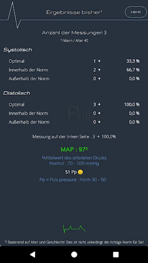 Result report of the measured values over a longer period of time including ‘mean arterial pressure’ (MAP)