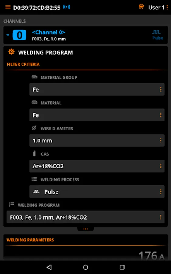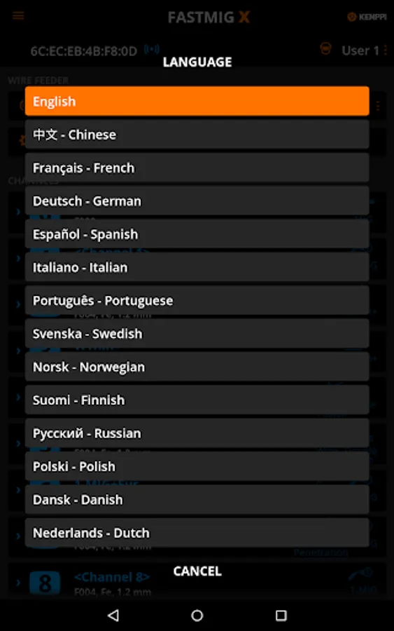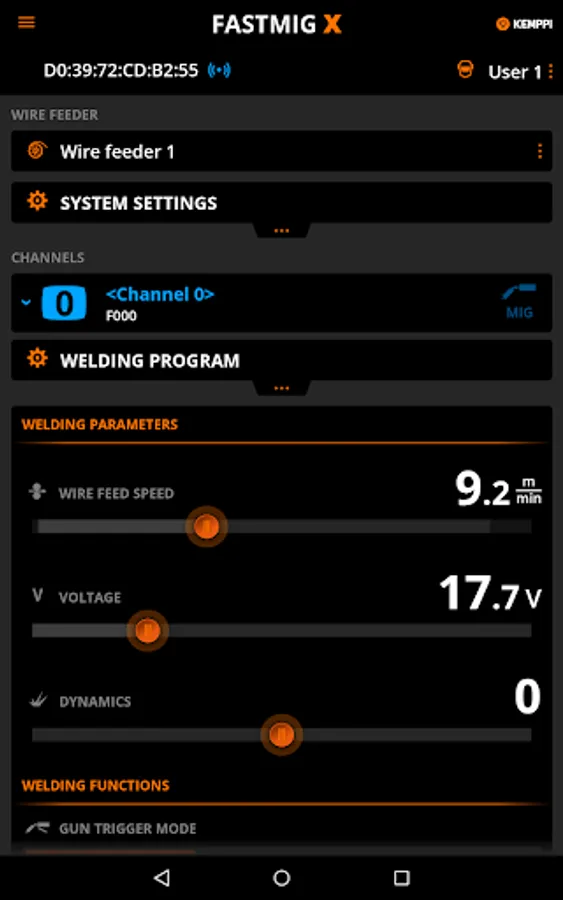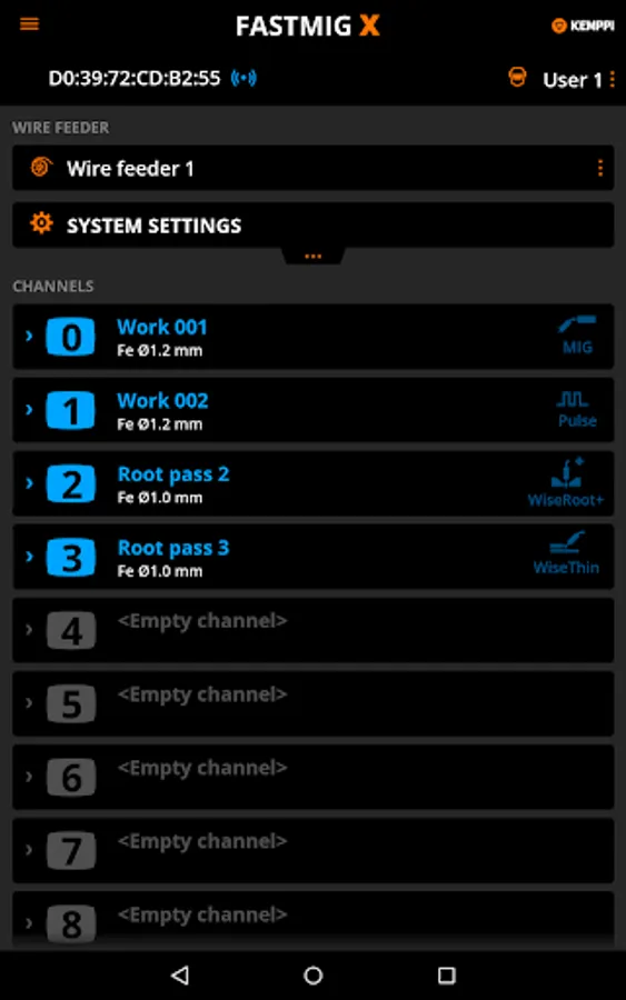 Kemppi's ARC Mobile Control connects to your welding machine and gives you full control of its welding parameters, the system settings, and all memory channels.