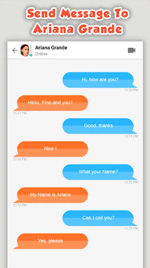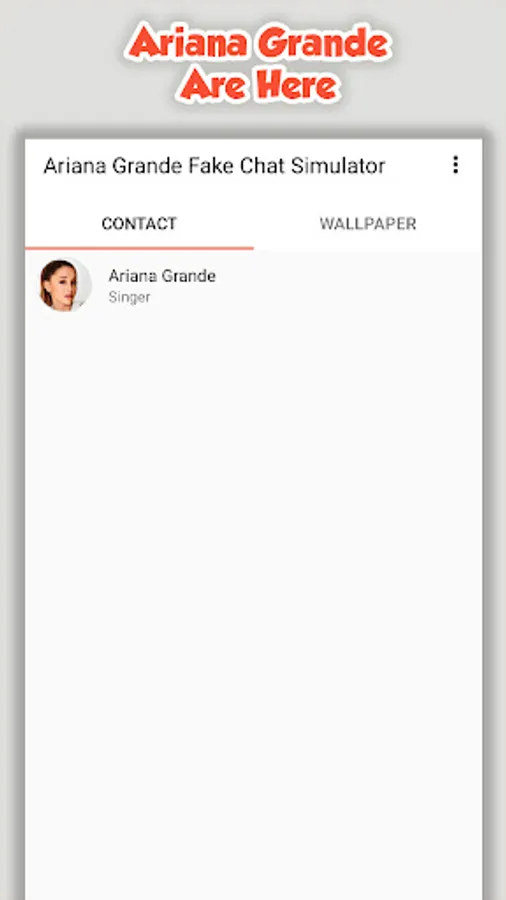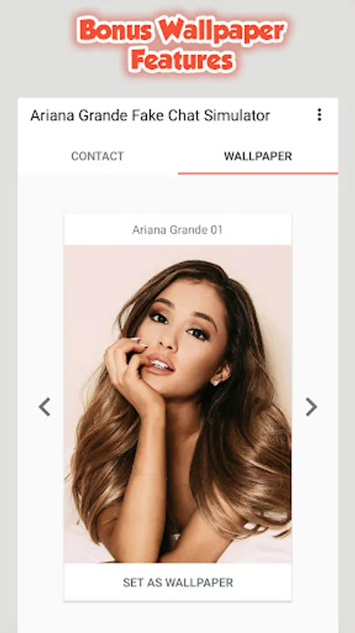 Ariana Grande Fake Chat Simulator is a chat simulator application and fake video calls. You can use it for entertainment. You can also communicate with Ariana Grande by using the Chat Simulator and Video Calls. There is a wallpaper feature in it. You can choose Ariana Grande wallpaper to decorate your device. Ariana Grande wallpaper is very complete.