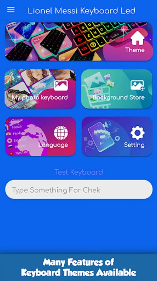 Lionel Messi Keyboard LED - Keyboard Theme is a new keyboard for Android with which you can decorate with photos of Lionel Messi. You can type messages with a new and not boring keyboard model. Lionel Messi there are many choices of designs and photos that you can use to decorate your keyboard. With this keyboard you can type fast and get the experience of typing messages with a modern keyboard model.