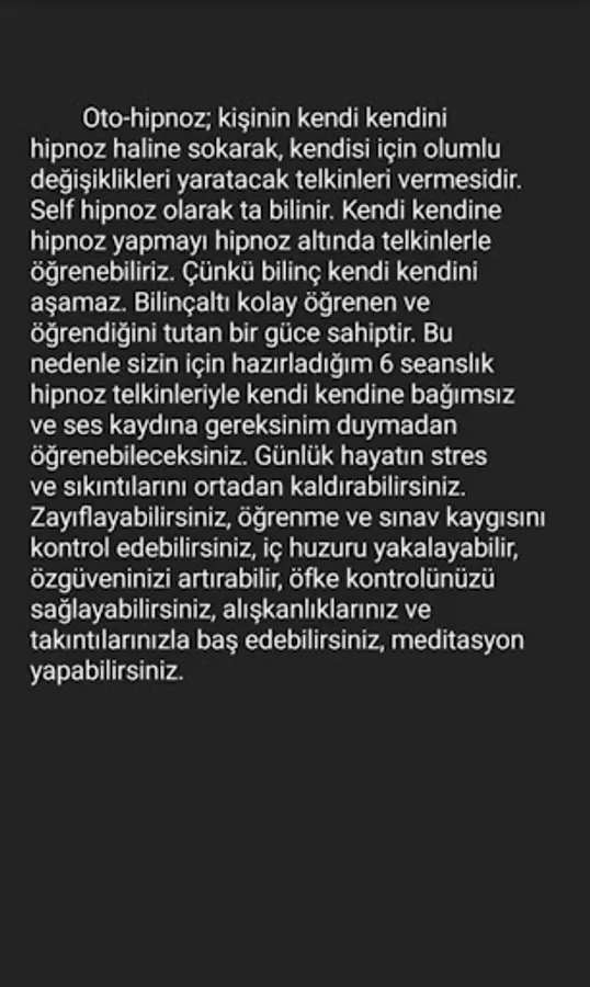 Hello, I am writing this hypnosis program as a result of my long researches and examining the subject of change that I put under the spotlight in the high consciousness center. In order to raise your consciousness with awareness, I will plant seeds under your subconscious in my application and it is in your hands to bloom ...