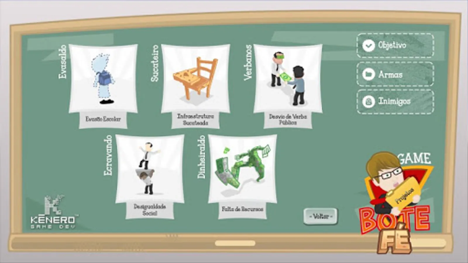With enemies: school dropout; lack of teacher; scrapped infrastructure; misuse of public funds; Lacking resources and inequality, the game brings to virtual reality a concrete and social situation that is unquestionably relevant to society.