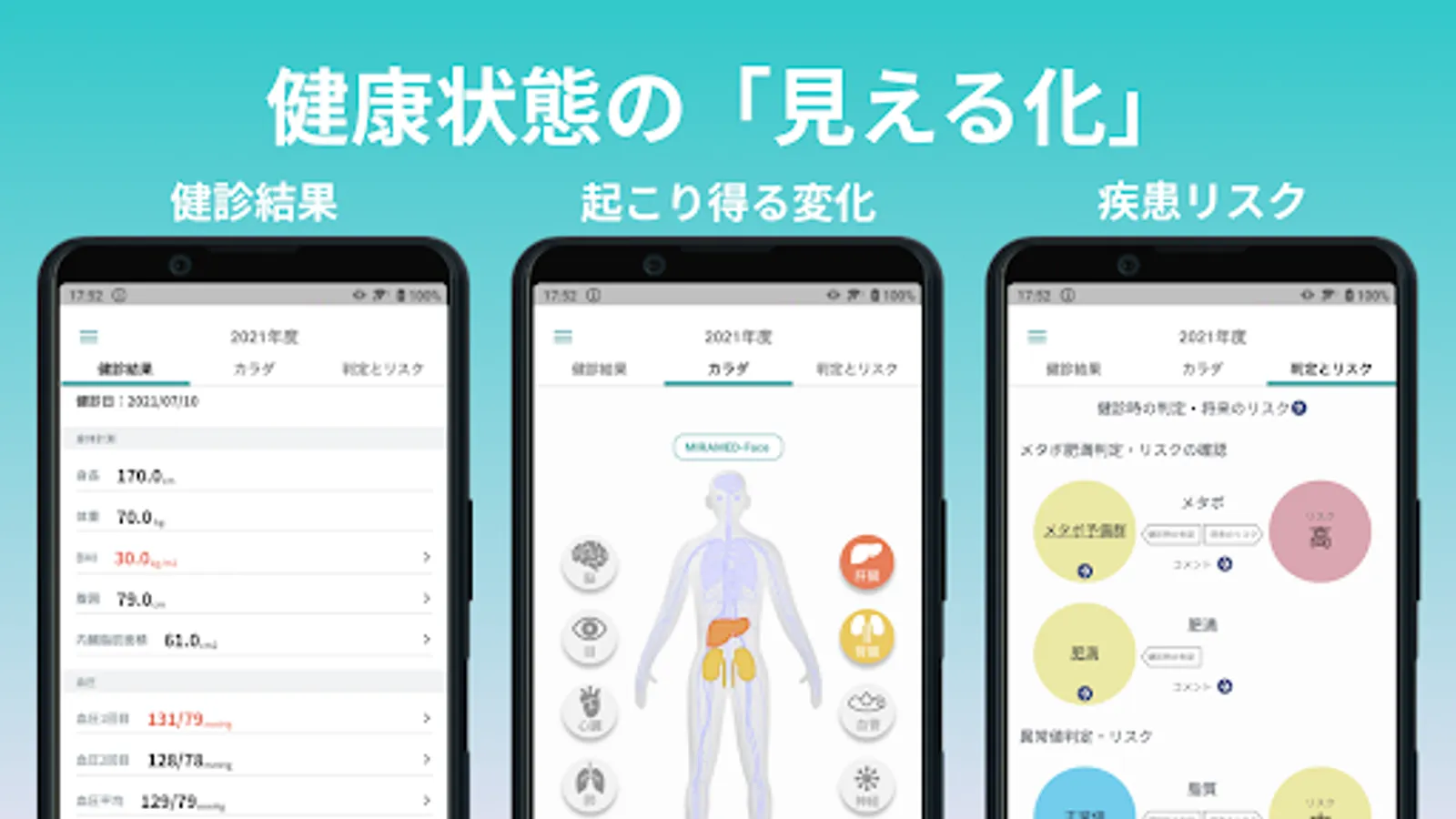 Health-related information such as health checkup results and lifestyle-related questionnaires is analyzed using unique algorithms such as AI, and the current or future state of body parts and disease risks that are likely to cause changes related to lifestyle-related diseases is displayed graphically. .. This kind of "visualization" promotes awareness and understanding of one's health condition, which is difficult to understand from the numerical values of the medical examination results alone. Being self-motivated motivates behavior change and supports the continuation of lifestyle improvement.