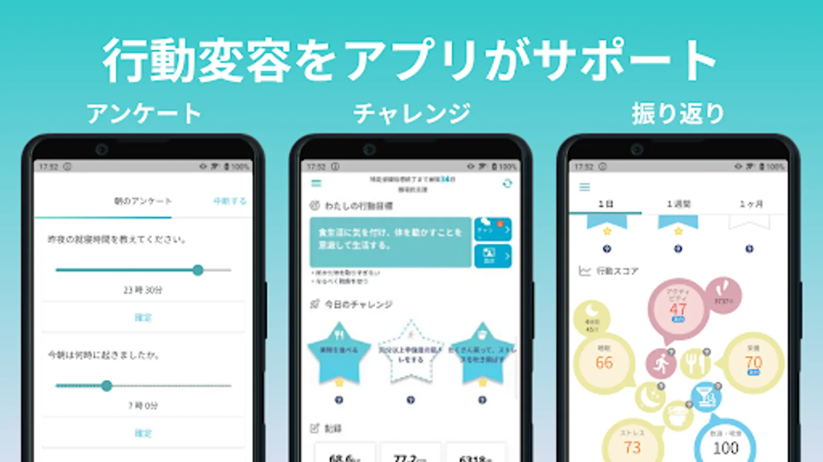 The application proposes a daily lifestyle improvement goal = challenge. The challenge is selected by the subject from five categories: nutrition, activity, sleep, stress, and drinking / smoking. In addition to scoring daily life, it supports the reflection of the target person and promotes behavior change and health promotion by displaying individual ways of spending and advice on a weekly basis.