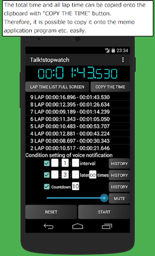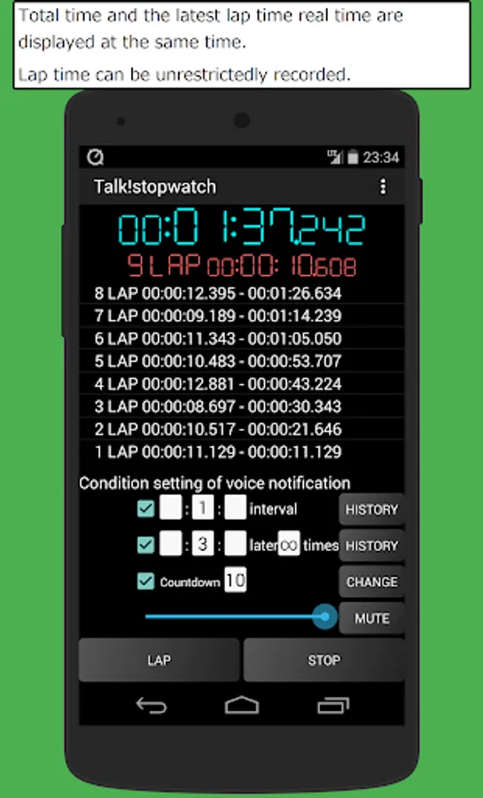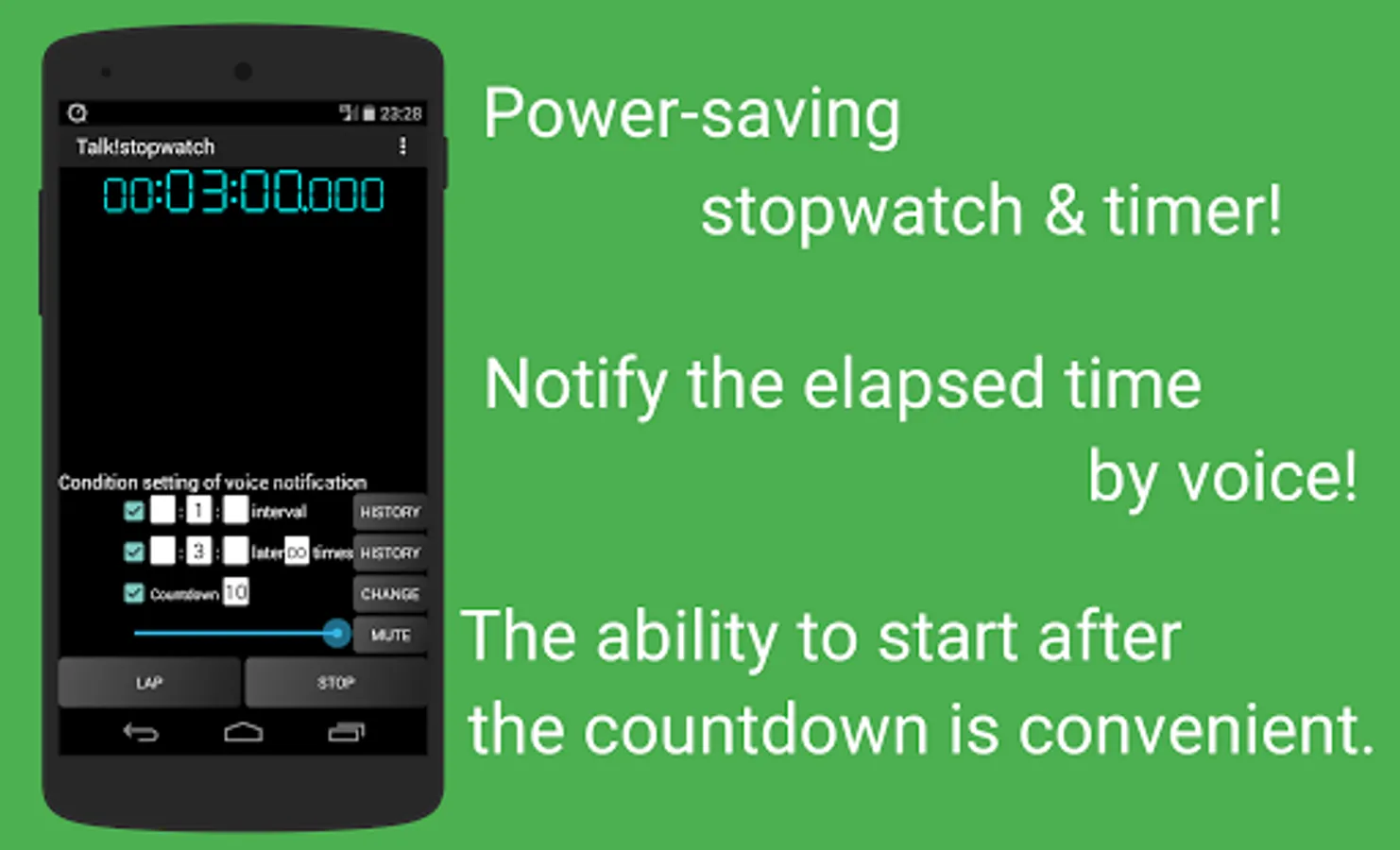 It is a simplest ultimate stopwatch and timer free app of the power saving to notify time by the voice at the specified interval time.
