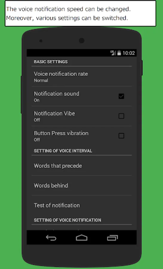 * Voice notification rate is Android4.0 or more.(Less than Android4.0 is in the Android terminal setting, Change in the "Text-to-speech settings".)