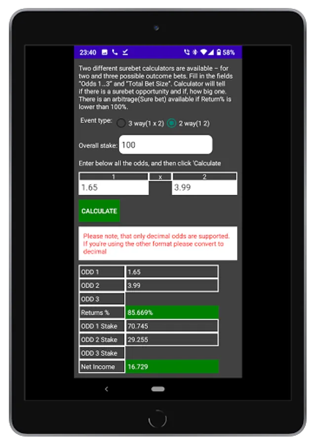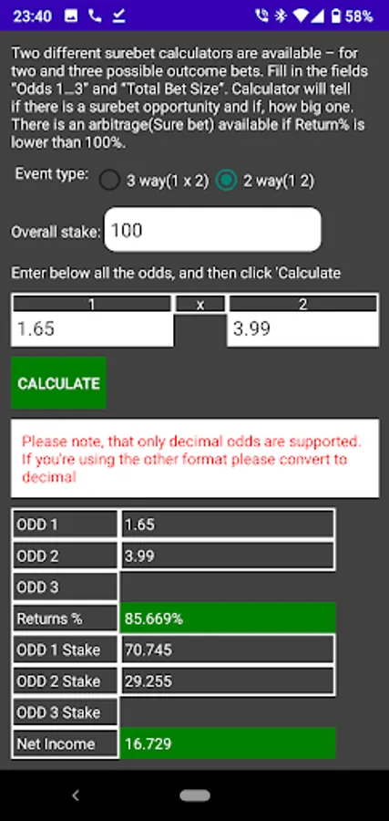You can use it to quickly calculate the correct stakes for each outcome of your surebet, which guarantee a profit regardless to the final outcome of the event.