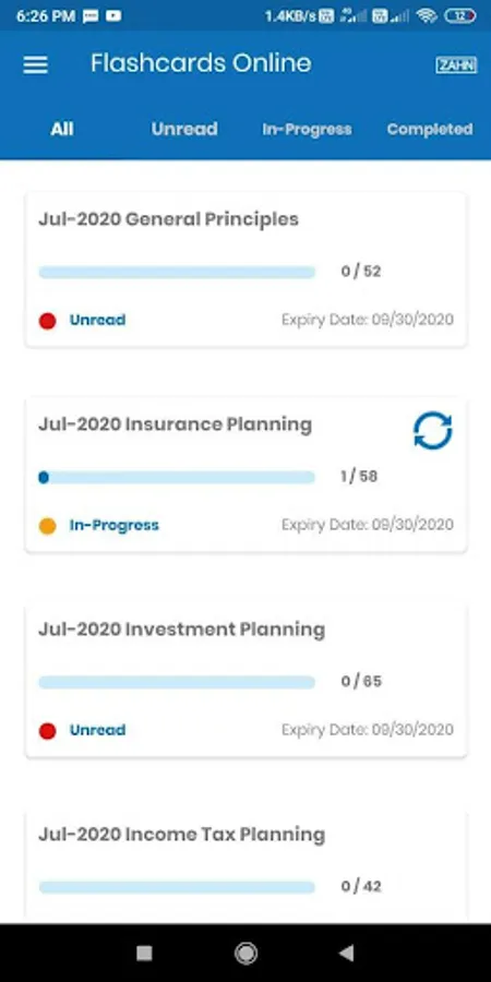 Zahn Student Center is a mobile resource for exam prep. This app is designed to assist in preparation for the CFP® Certification Examination. The flashcards study will enhance the ease of learning difficult concepts. They are designed to complement the Live Review program materials. Approximately 55 cards per section.