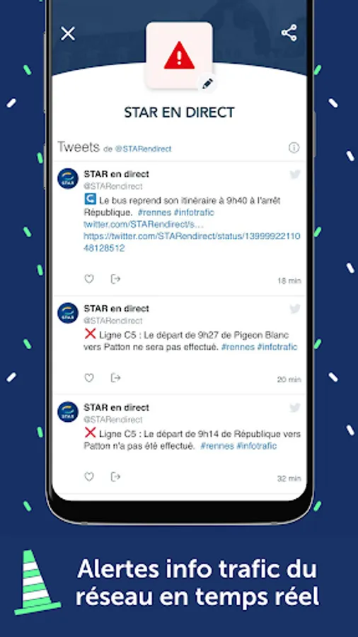 For your occasional or daily journeys, find all the information of the STAR network in your application. In the blink of an eye, consult timetables, routes, alerts according to your mode of transport: bus, metro, bike or carpooling.