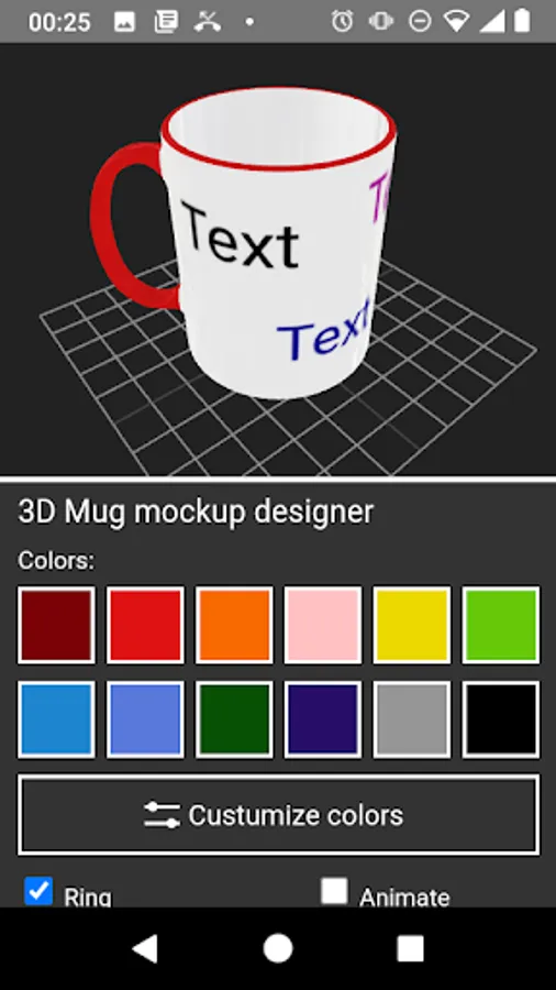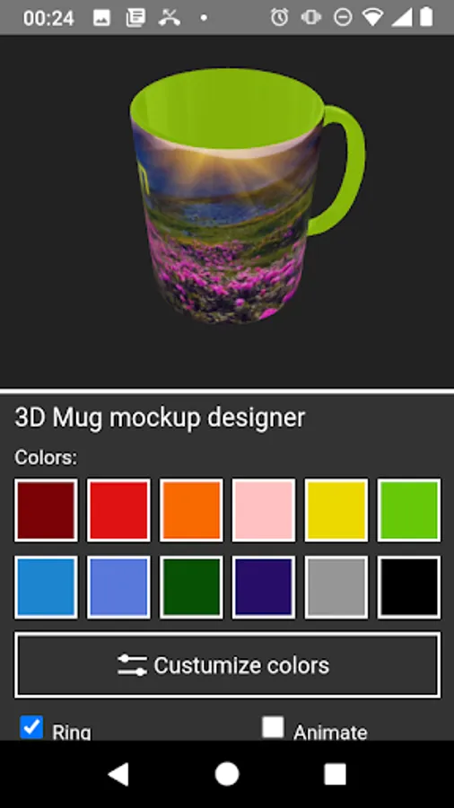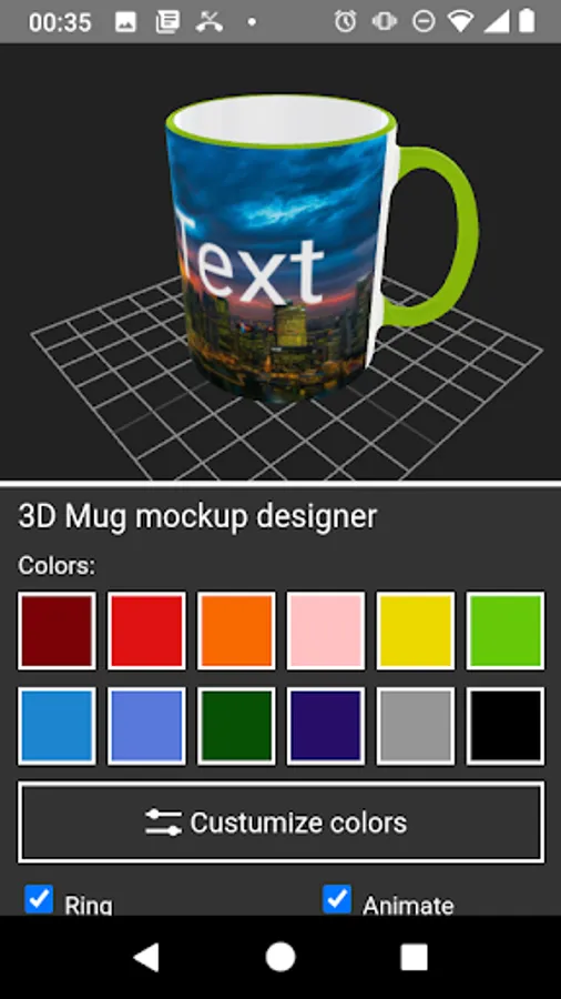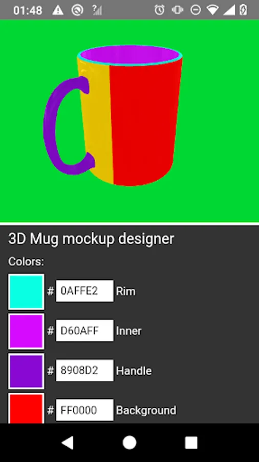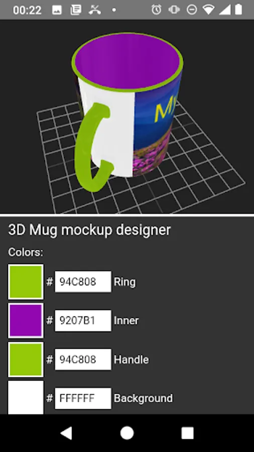 You can create your own custom sublimation mug design, rotate the 3D model, download the created PNG mockup, take a snapshot of the 3D scene in PNG format, and also record a video in WEBM format.
