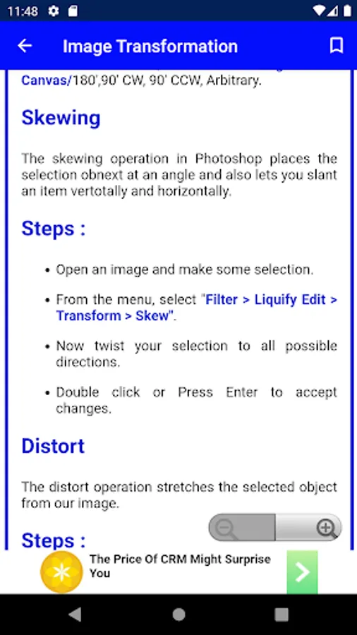 Photoshop Android Tutorial Application can teach how to use filters, adjust colors, crop, resize, remove blemishes, add text and graphics, and perform advanced editing techniques like layers and masks. The app is user-friendly and supports touch gestures for easy navigation.
