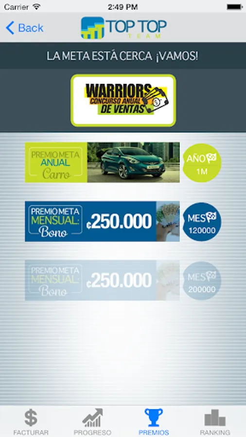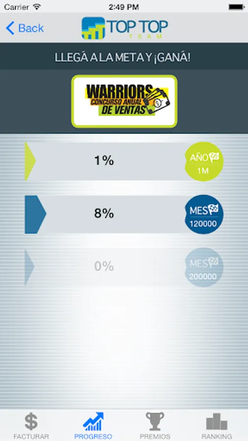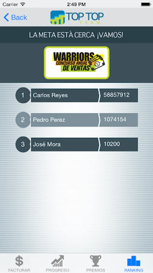 Datos de facturación: Cada vez que un vendedor realice una venta, simplemente deberá digitar el número de factura y el número del monto de la misma para ir subiendo en su progreso.