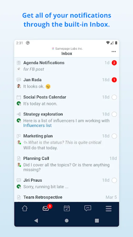 Samepage facilitates communication, project management, running meetings, online collaboration, and more by combining team chat, video conferencing, screen sharing, task management, file sharing, and real-time team document collaboration in a single cloud-based collaborative workspace.