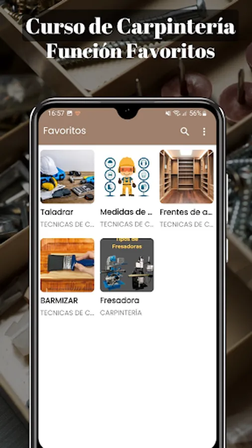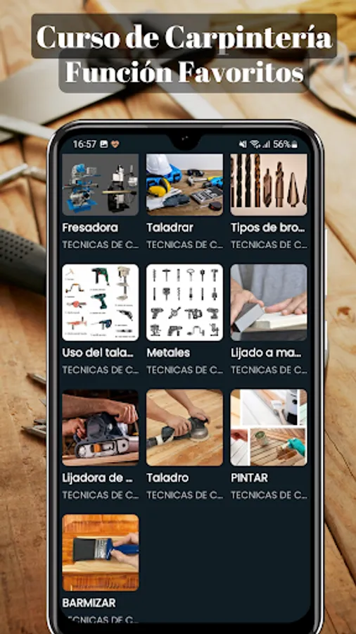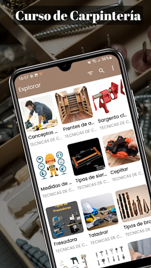 Basic knowledge of carpentry Basic concepts of measuring. What are the measurement tools. Advice for a correct measurement, and Custom Furniture and Closet Fronts and type of Sergeants or Cats. Carpentry Techniques Material Preparation, Cutting and Sawing, types of Electric Saws, Planing, Material Modification. Mill. Drill. Finishes. Sand. Paint. Varnish.