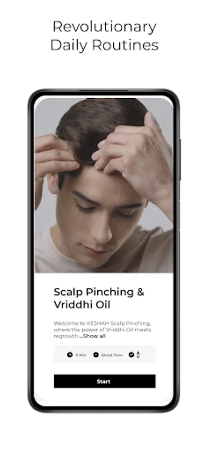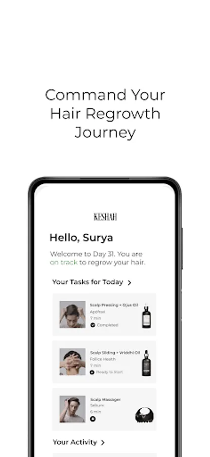 Our app is designed to integrate seamlessly with the KESHAH Black Kit, unlocking an empowering pathway to hair restoration. Your daily routines, powered by our potent products - Ojus Oil, Vriddhi Oil, and a specialized Scalp Massager, become a revolution in just 20 minutes a day. This scientifically validated regimen, harnessed by the app, holds the key to hair regrowth.