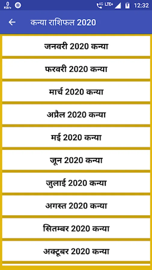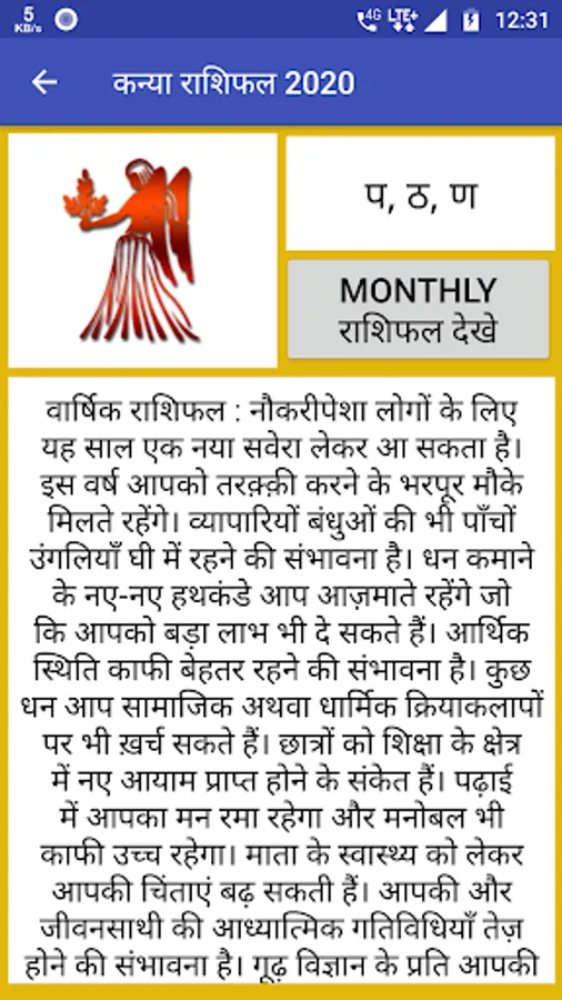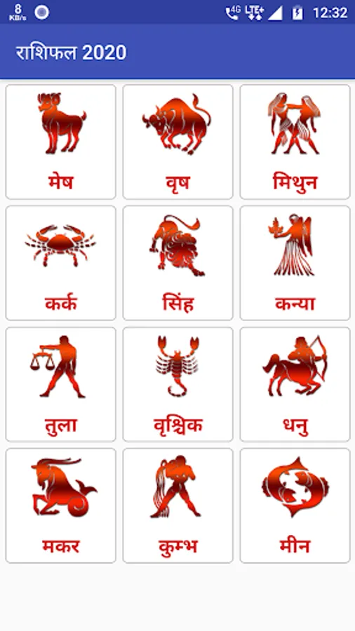 Mesh (Aries),Vrush (Taurus),Mithun (Gemini),Kark (Cork),Singh (Leo),Kanya (Virgo),Tula (Libro),Vrishichal (Scorpio),Dhanu (Saggitarius),Makar (Capricorn),Kumbh (Aquarius),Meen (Pisces) In Hindi Language Rashifal 2020 is an app which provides full Yearly Horoscope an easy way and you can also know many others interesting things about you and your life. This app is based on Indian Astrology,Predictions,Numerology,and Lalkitab rashifal for all Rashis in Hindi language.