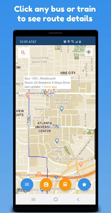 Use the map and real-time data to track the location and current route for any Marta vehicle/train