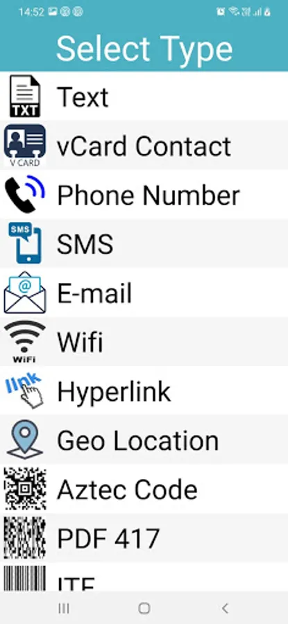 Supported code types for scanning and reading: QR, Aztec, Code 128, Code 39, Code 39 Mod 43, Code93, Data Matrix, EAN-13, EAN-8, Interleaved 2 of 5, ITF-14, Pdf 417, UPC-A, UPC-E.