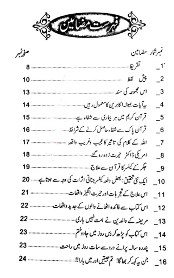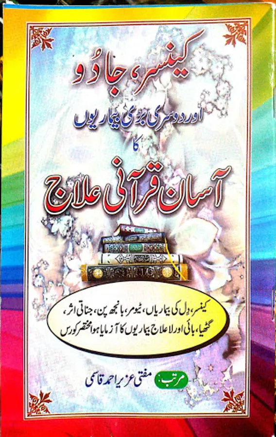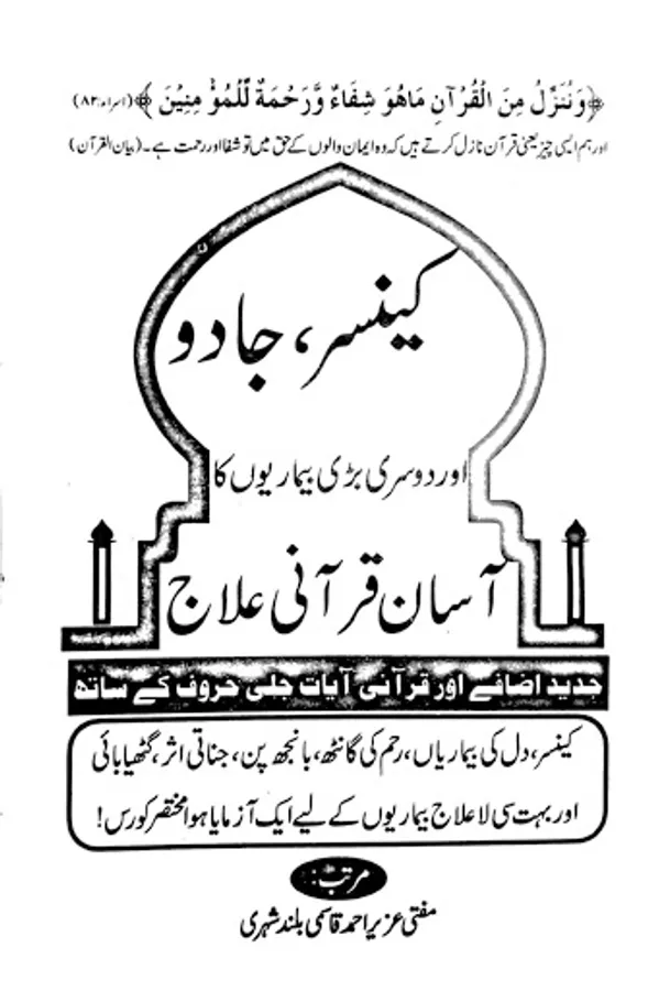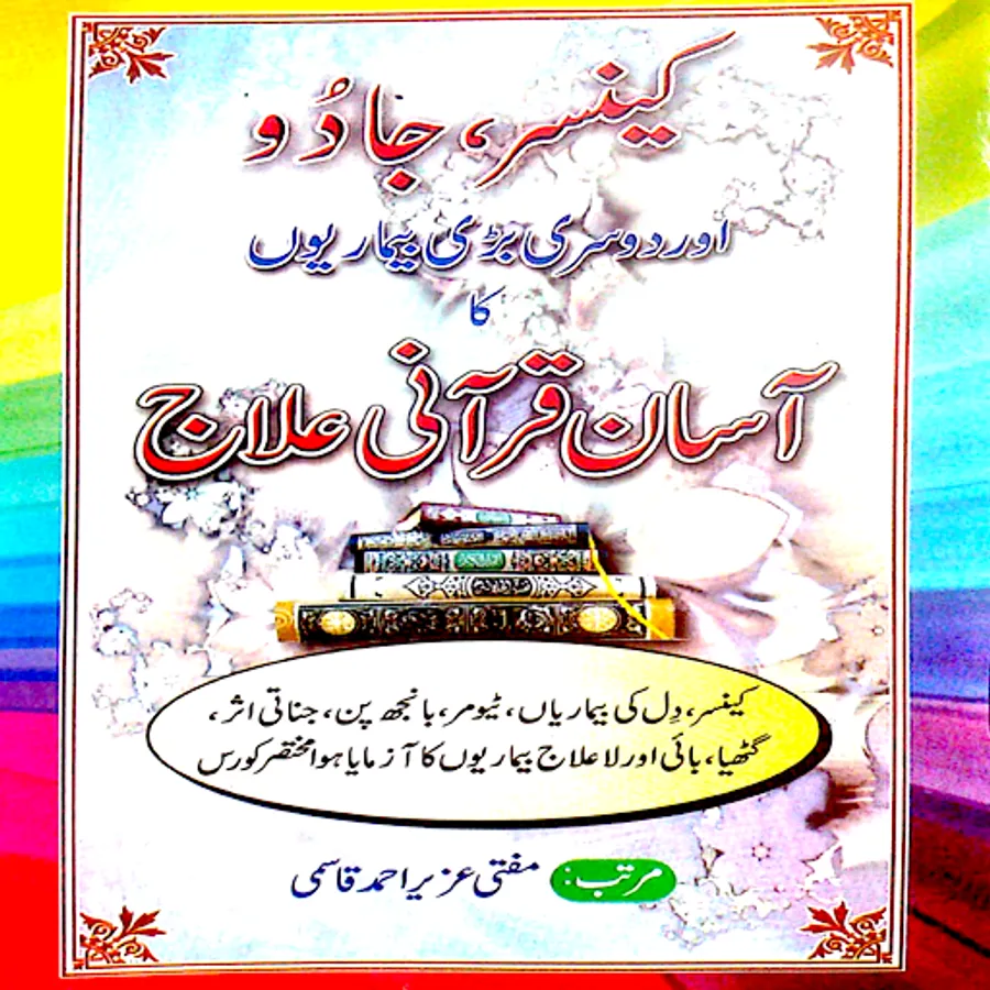 Is Kitab main Takreeban Qurani Aayaat Hai Or Quran Pak Se Har Beemari Ka Elaj Bhi Hai Khas kar ke Jaan Lewa Beemariya Main Se Bohat Barri Beemari Cencer Ki Hai uska elaj bhi mojod hai quran pak main.