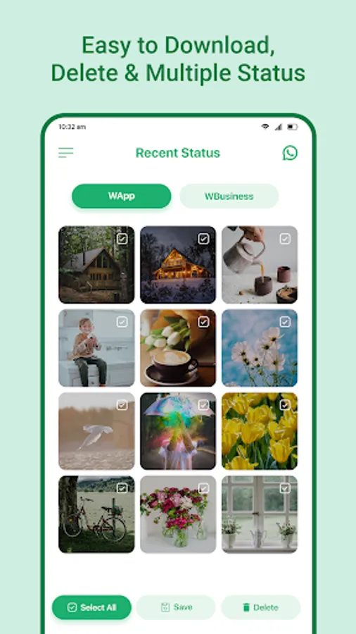 This app allow you to download images, GIF and Video status from your WA or WA Business and easily share with your friends.