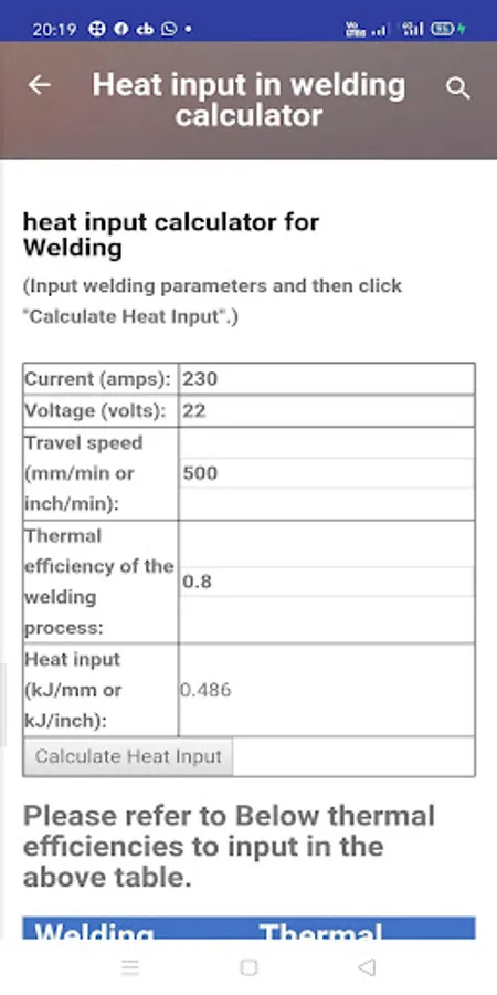 2-Input current in Amps, Voltage in Volts and Travel speed in mm/min, inch/min, cm/min or m/min the unit of HI depend on unit of Travel speed for eg. If you input HI in mm/min then calculated HI will be KJ/mm.