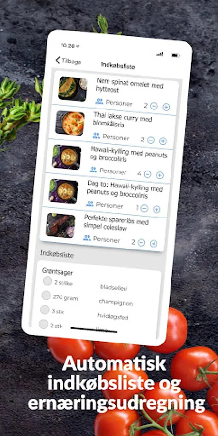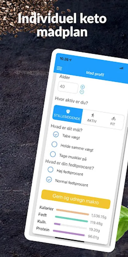 With our app you can fill in your food profile, and automatically get to know how much you need to eat of calories, carbohydrates, fat and protein, to lose weight, keep your weight or gain muscle. Our calculator is optimized for Danish and realistic conditions through several years of experience.