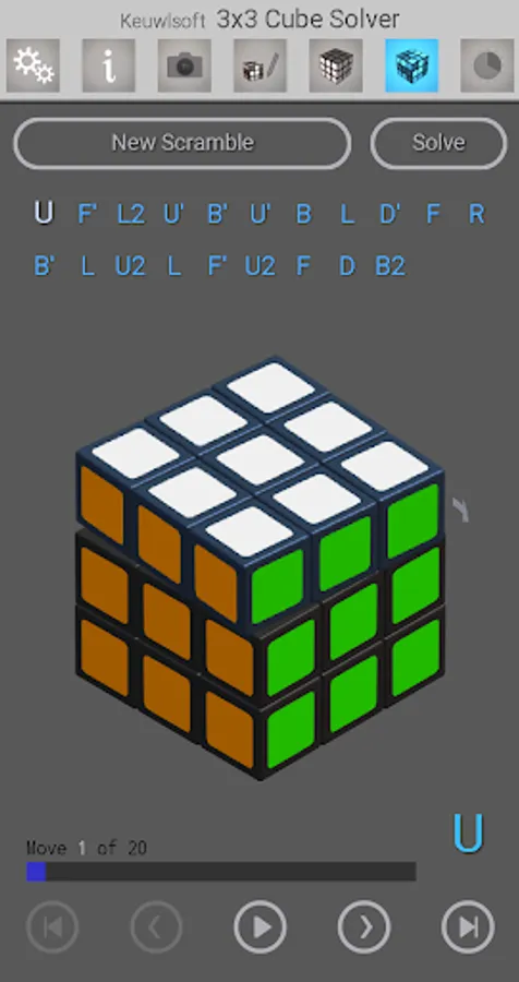 Capture the state of your 3x3 cube (also called a Rubik's cube) with the camera, and then follow the animated solution.