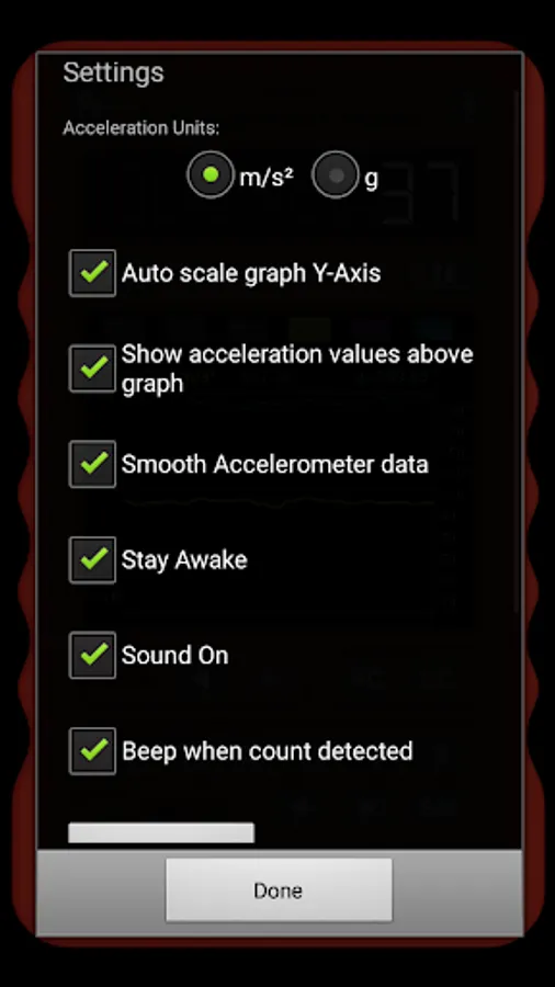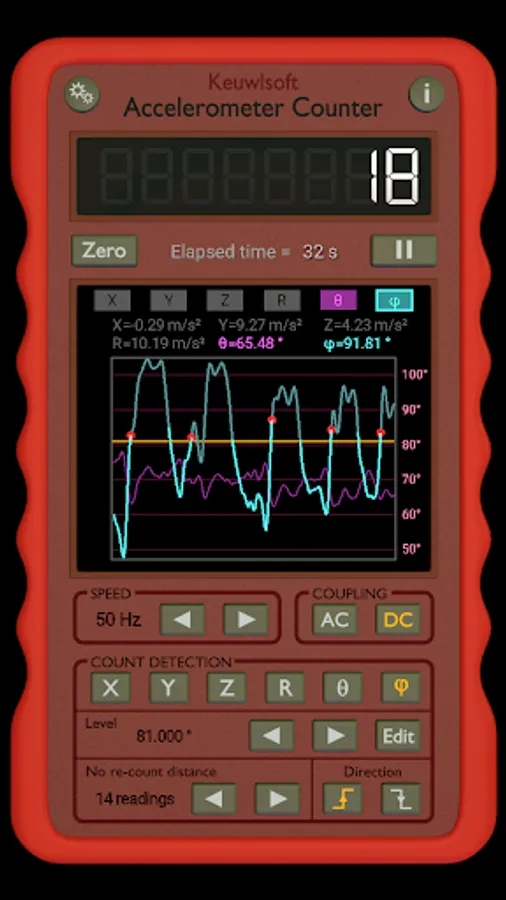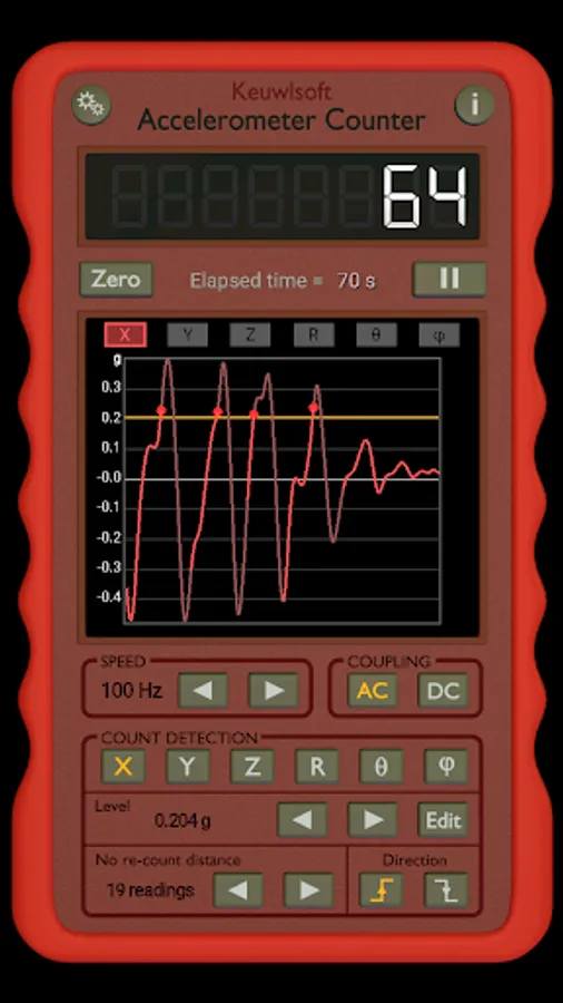 Count accelerometer events with this app by shaking or rotating your device. The accelerometer sensor is continually monitored and when the detection level is crossed, the counter is increased by one.