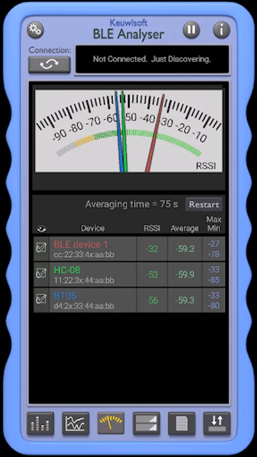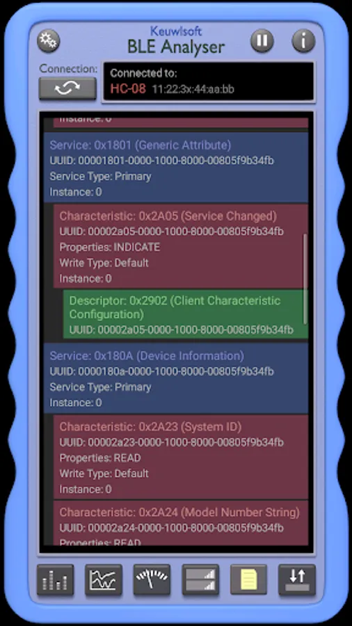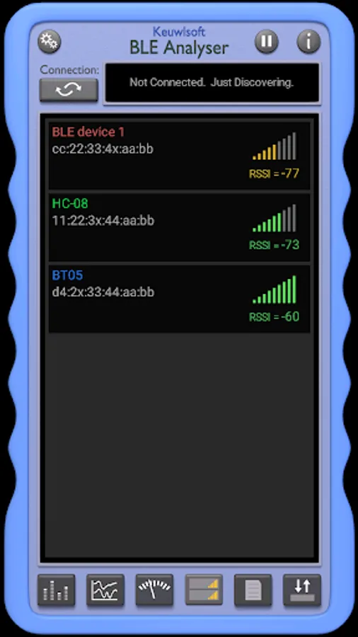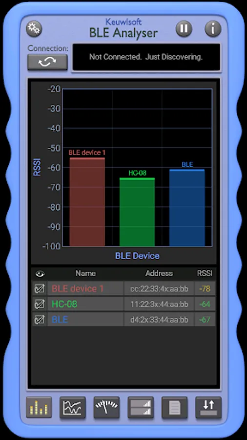 Measure RSSI strength of nearby Bluetooth Low Energy (BLE) devices. Connect to them to get a list of Services and Characteristics on the BLE device. Read and write to Characteristics and Descriptors.