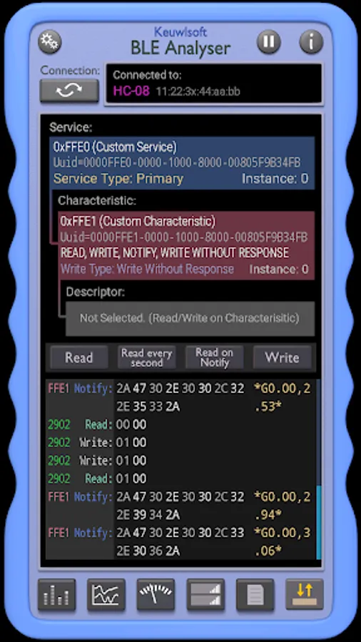• Write ASCII, Hexadecimal, 32-Bit Integers or Floats to Characteristics or Descriptors.
