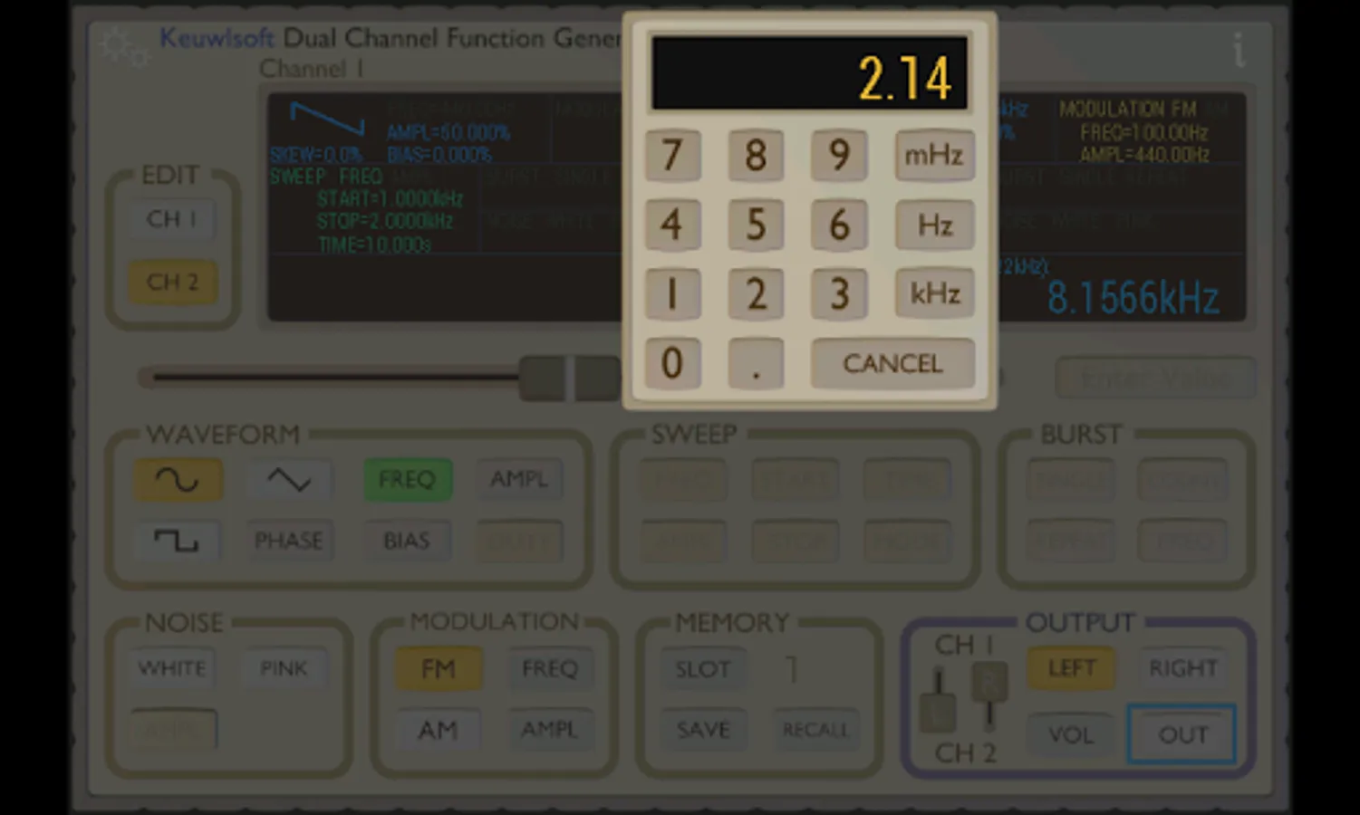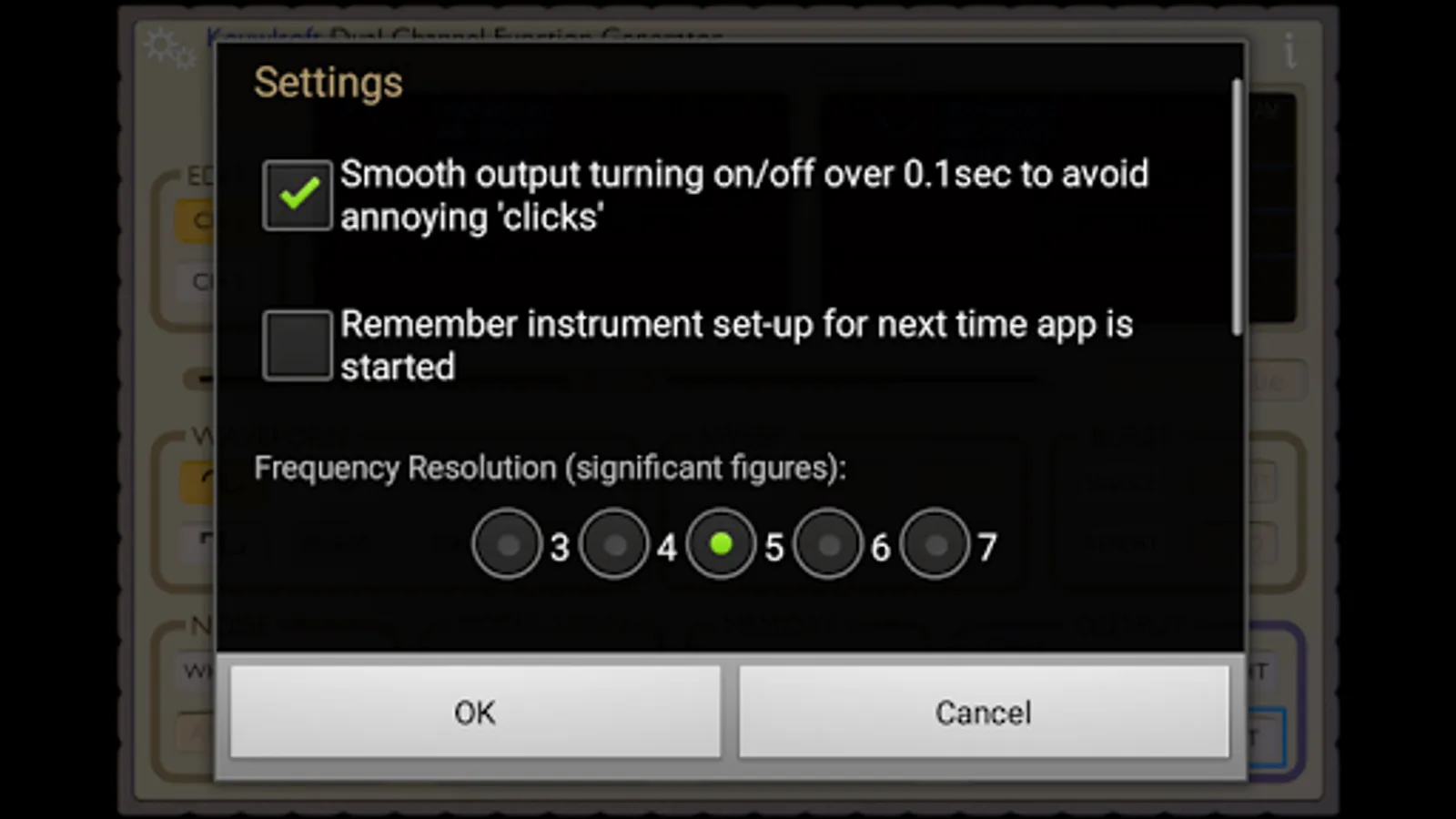 Output is 16 bit for each left and right channels and at 44.1kHz. Output will depend on your device hardware. Some device hardware may may filter out the DC bias and low frequency signals. At high frequencies, the waveforms will be distorted due to limited number of samples for each waveform (for example at 4.41kHz, a sine waveform will be approximated by only 10 points). Therefore this is for fun/educational use, for critical applications use a real calibrated function generator.