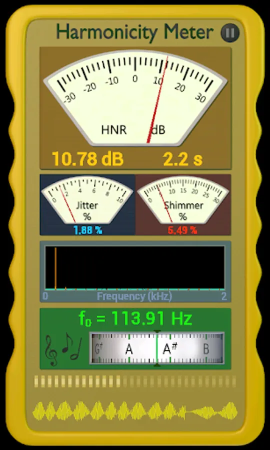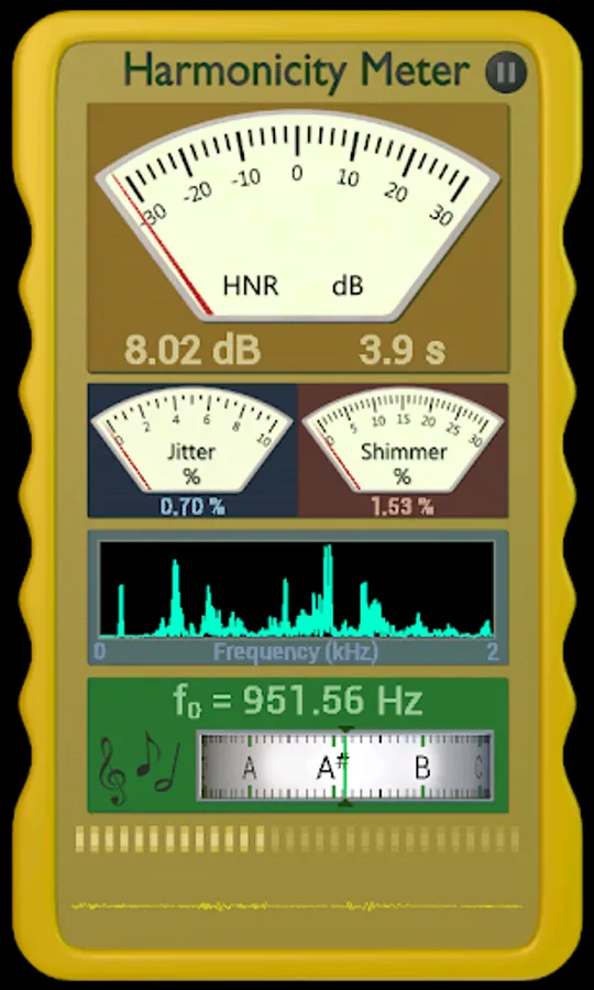 Averaging - After 0.7s, the app will start averaging the Harmonicity, Jitter, Shimmer and freqency values. This will continue until the sound is stopped at which point the last 0.7s of data is removed from the averaged values.