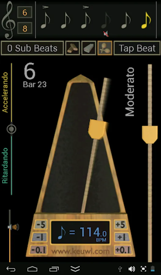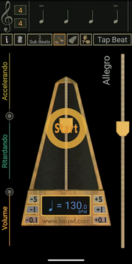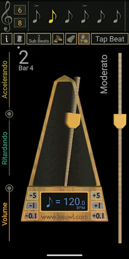 ♩ Accelerando slider for gradual speeding up/slowing down. (0.1 to 10 BPM/bar)