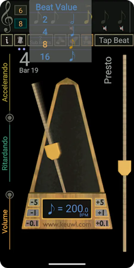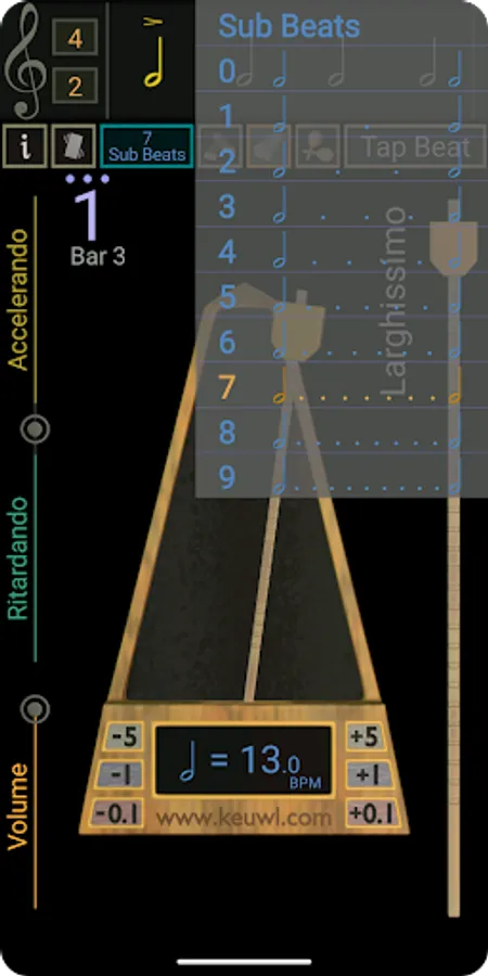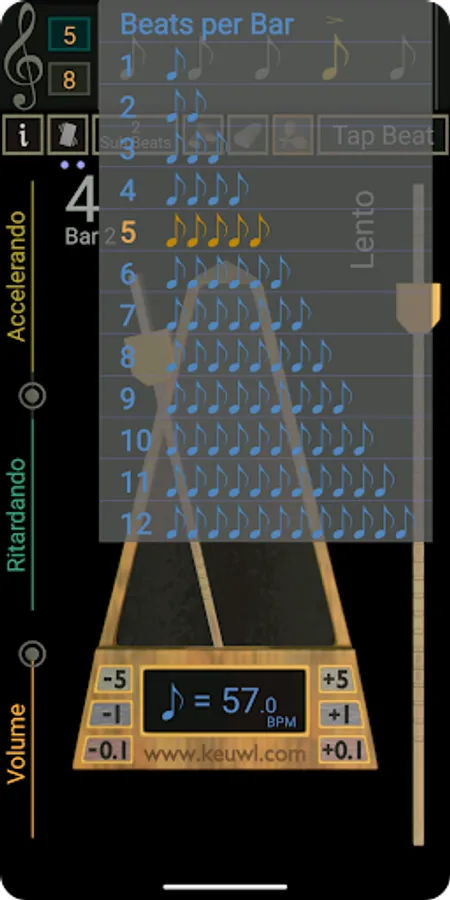 ♩ Select up to 12 Beats per bar. Set beat value to half note, quarter, eighth or sixteenth.